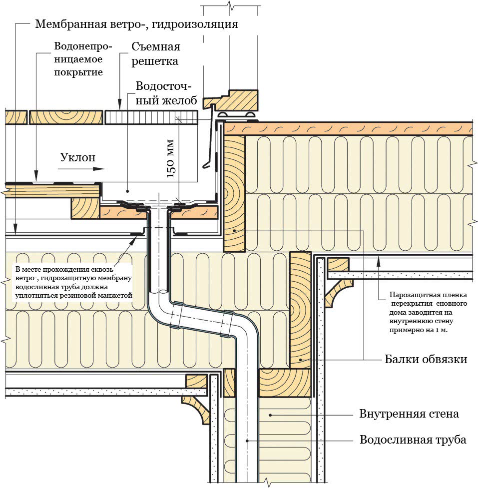 Рис. 812b. Устройство изолированной вентилируемой террасы с внутренней системой водоотвода. Балки террасы опираются на каркас несущей внутренней стены, а балки перекрытия основного дома опираются на балки террасы. Водосборная воронка располагается у стены основного дома, водосливная труба встраивается во внутреннюю стену 1-го этажа.