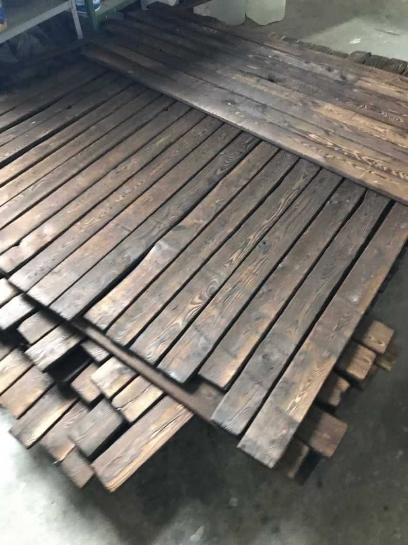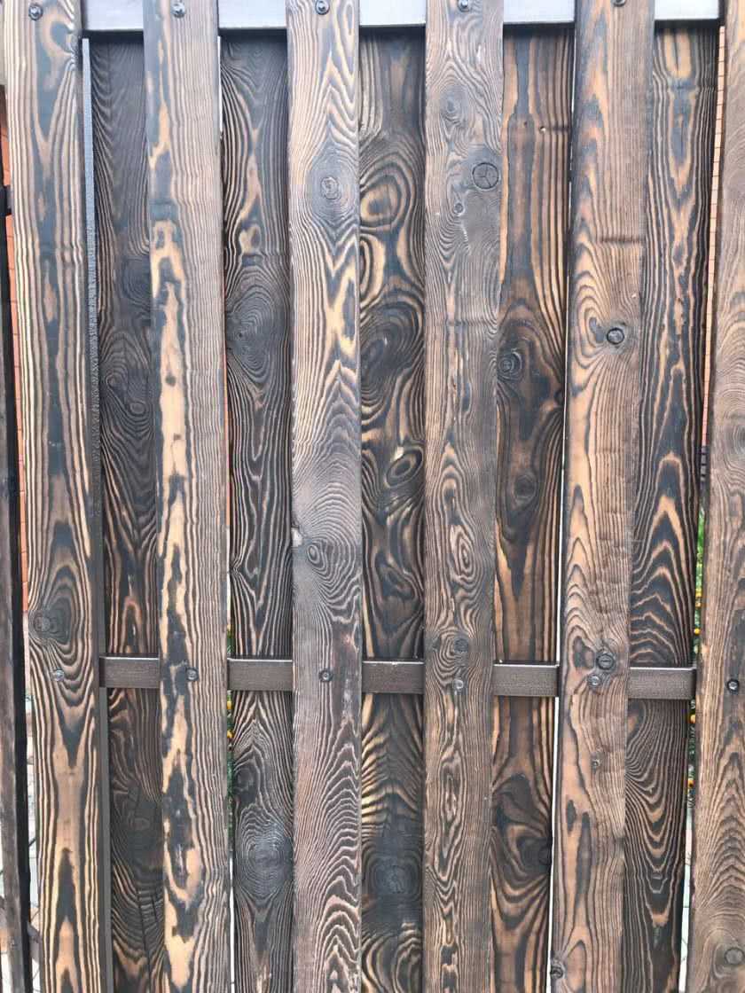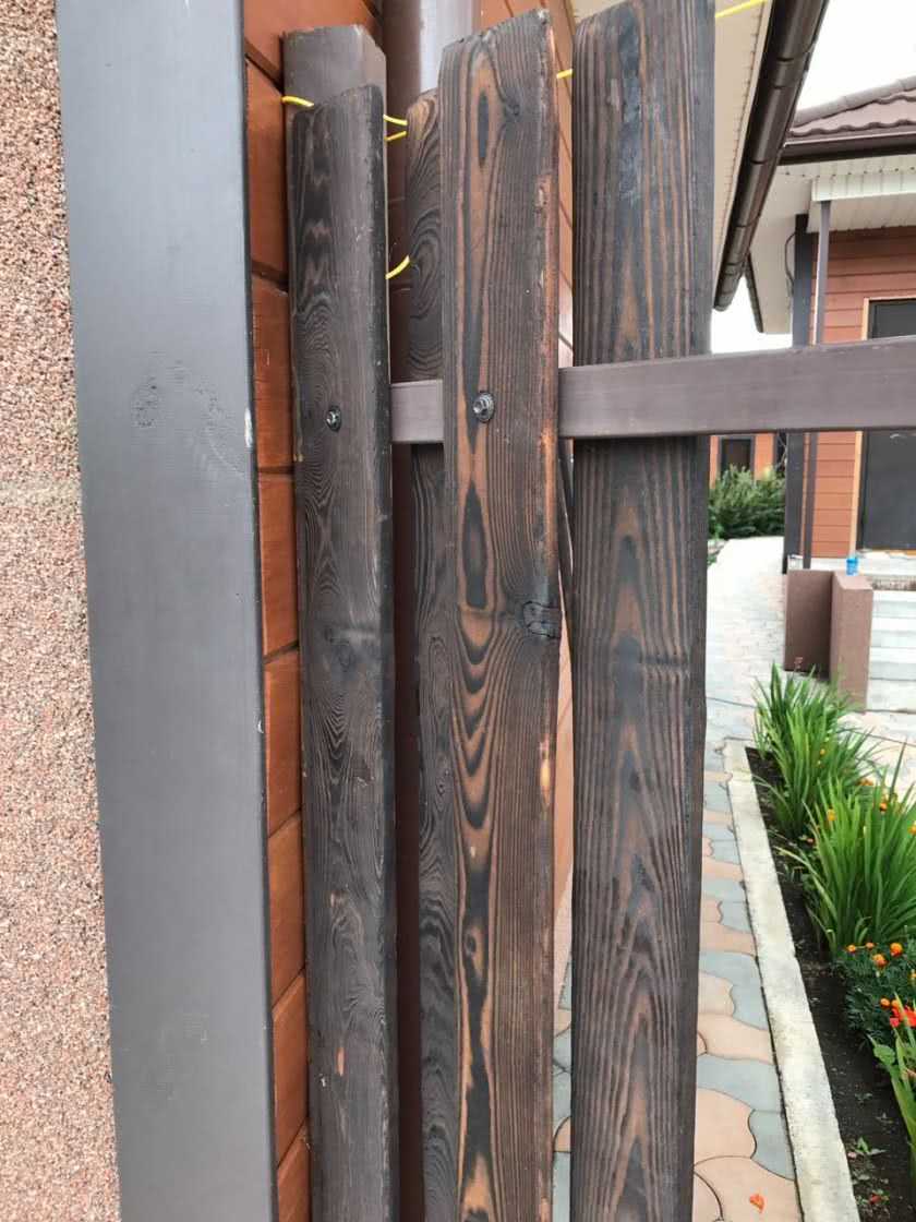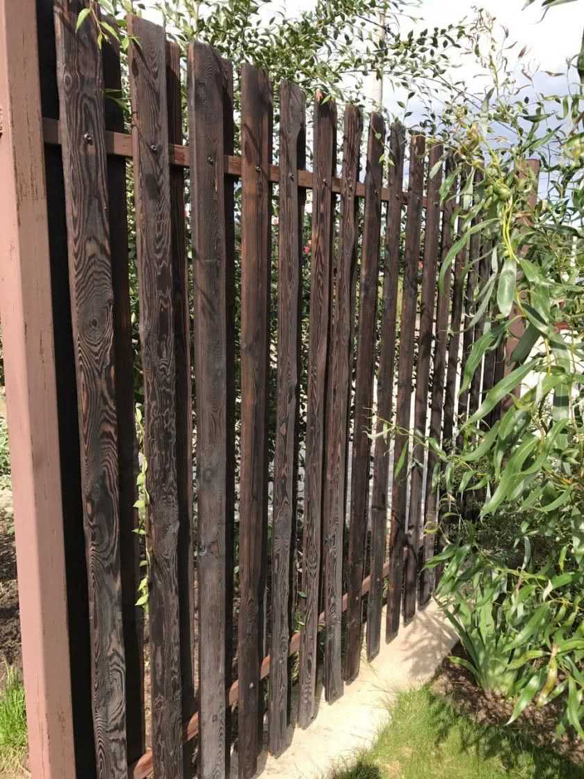 - штакетины слегка обжигают с помощью горелки, создавая на них небольшие подпалины, которые соответствует русскому купеческому стилю;