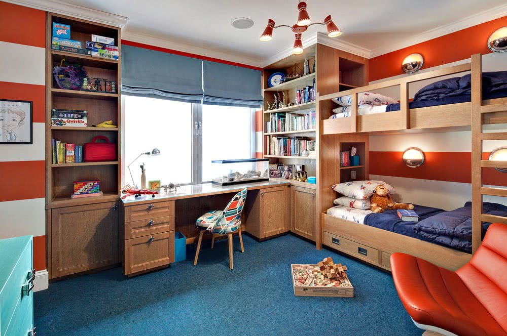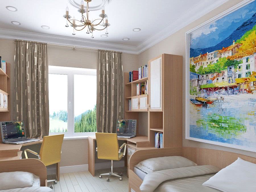 Для организации пространства для двух учеников придется постараться. Главное при этом — ни одного из детей не ущемить в плане справедливости распределения места. Для ребят примерно одного возраста и однополых делят его по принципу 50/50. Обоим одинаковые кровати, столы и стулья. Всего всем поровну, иначе дети будут постоянно соперничать, ругаться. В оформлении такого дизайна детской комнаты для школьников двухъярусная кровать станет идеальной. Это актуально для малогабаритного пространства.