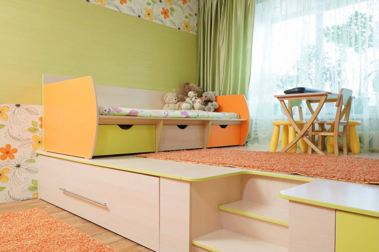 Подиумные конструкции также могут быть использованы, чтобы отделить детскую территорию. Но этот вариант потребует больше вложений и может быть выполнен только на заказ.