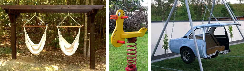 Качели на А-образных опорах с разными типами сидений (от простой планки до прочного кресла) идеально подходят для летнего отдыха детей и взрослых. Переносные качели-гамак могут выдерживать пару взрослых и устанавливаться в разных частях участка. Если же речь идет о семейном отдыхе, во время которого и взрослым и детям будет приятно покачаться на удобных качелях, вариант со скамьей на П-образной раме наиболее оптимален за счет прочности и удобства.