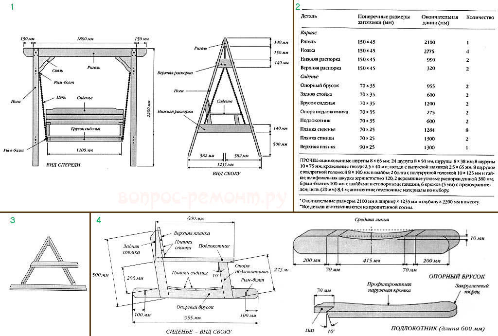 Чертежи семейных качелей такого вот «классического» типа приведены на рис; длина ножек дана в расчете на их заглубление в землю на 0,5 м: