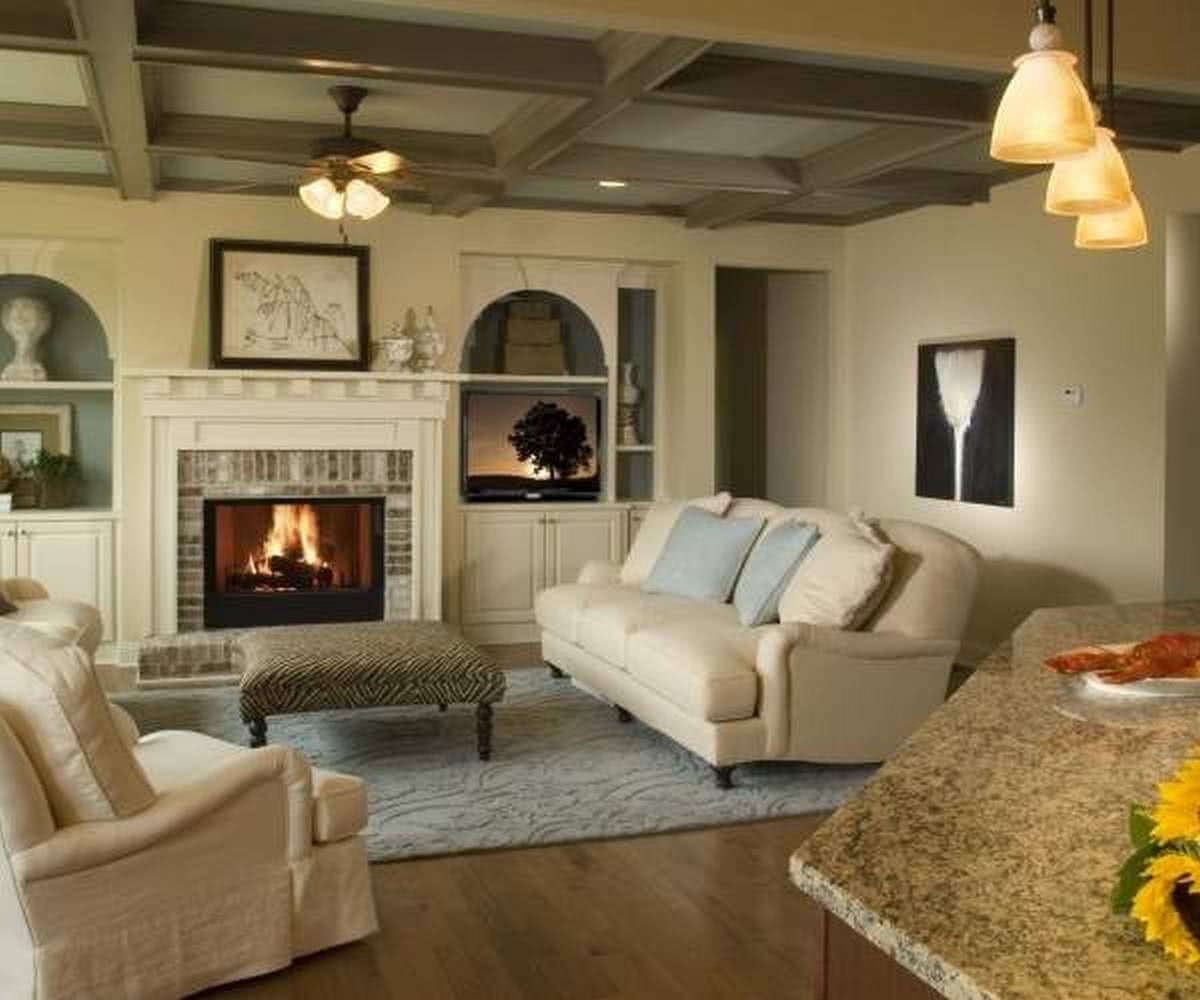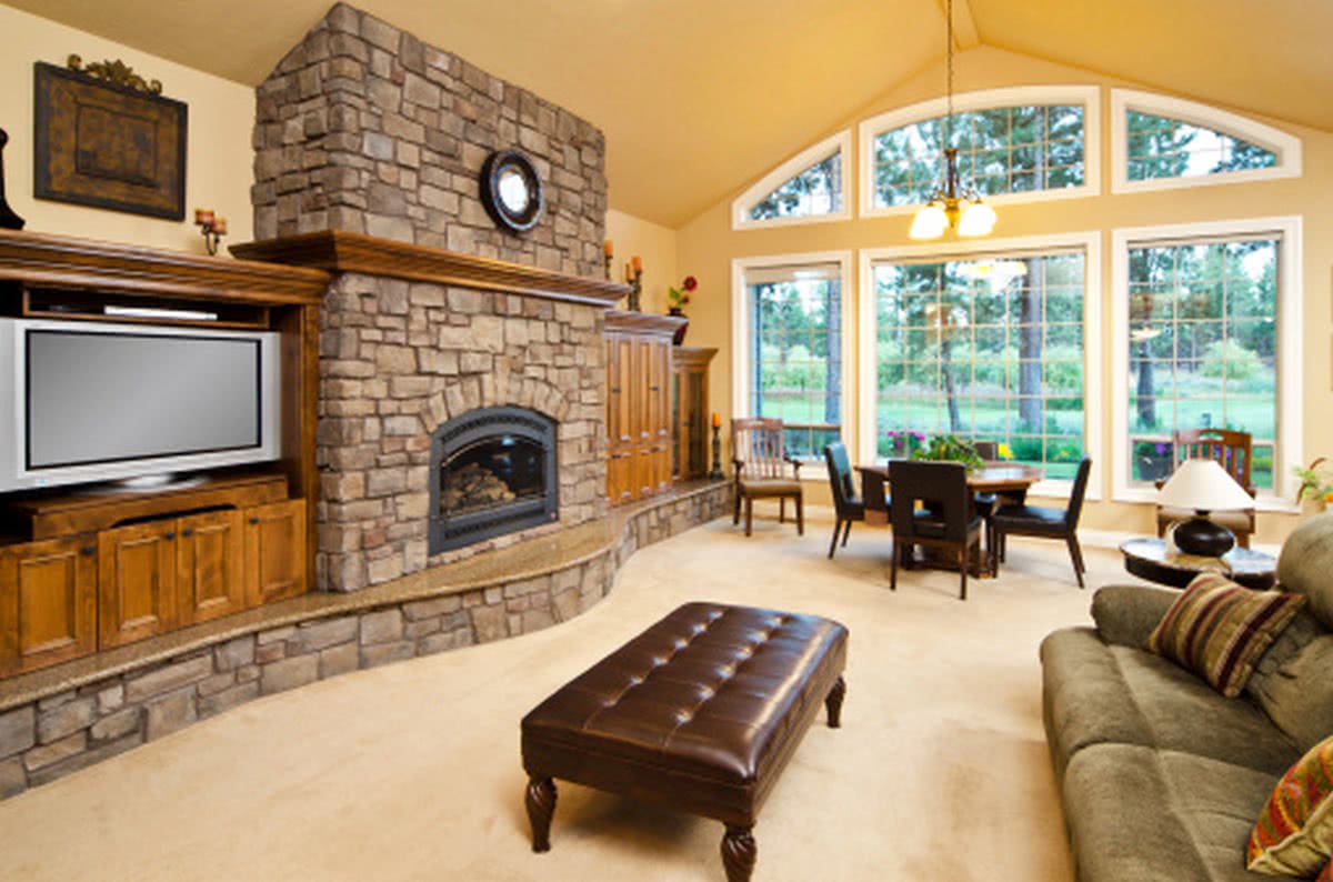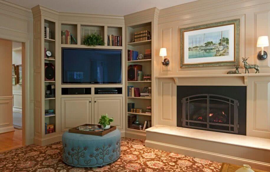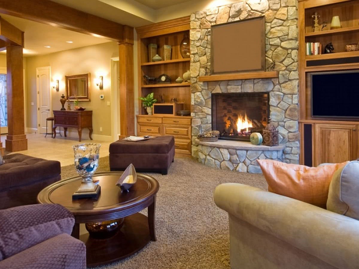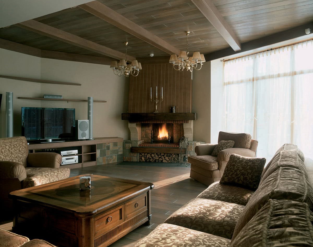 Дизайн зала с камином в частном доме