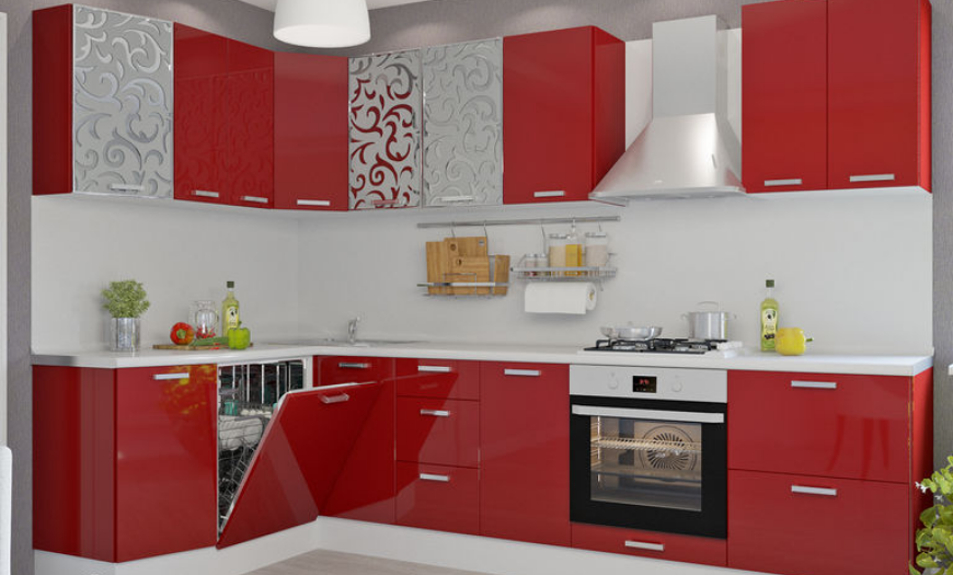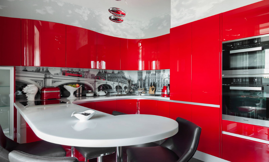 Чтобы сделать оформление кухонного пространства максимально ярким, можно остановиться на красных цветах интерьера. В такой палитре лучше выбрать теплые тона с желтым или коричневым отливом, либо холодные — с синими и фиолетовыми акцентами. Грубая ошибка — использовать чистый красный, т.к. он быстро надоест и будет выглядеть раздражающе.