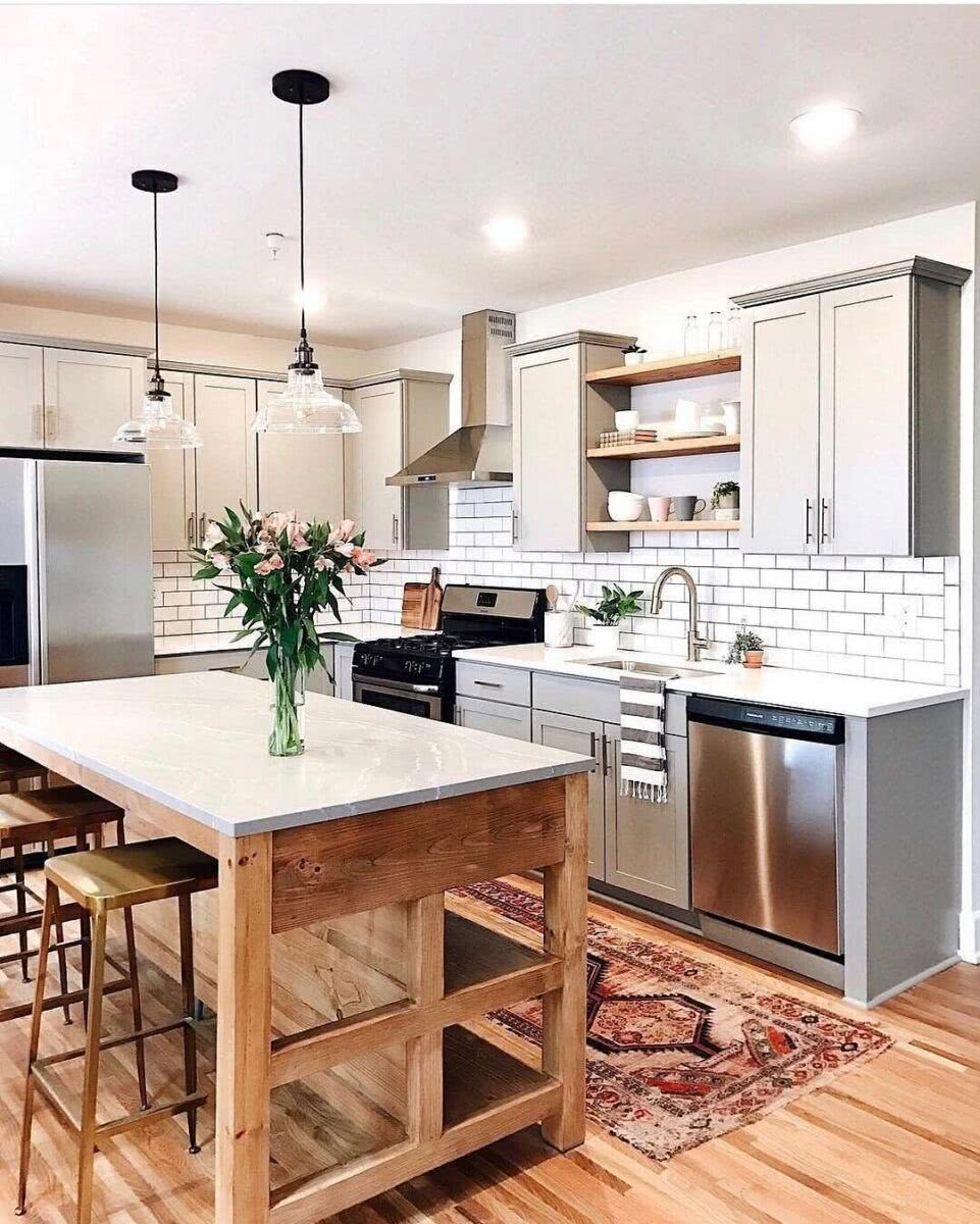 для отделки помещения с такой планировкой подойдет и стиль кантри, низ «острова» можно облицевать керамической плиткой, аналогичной фартуку, а над ним разместить полочки для тематических аксессуаров — связок лука, трав, плетеных корзинок и керамической посуды.