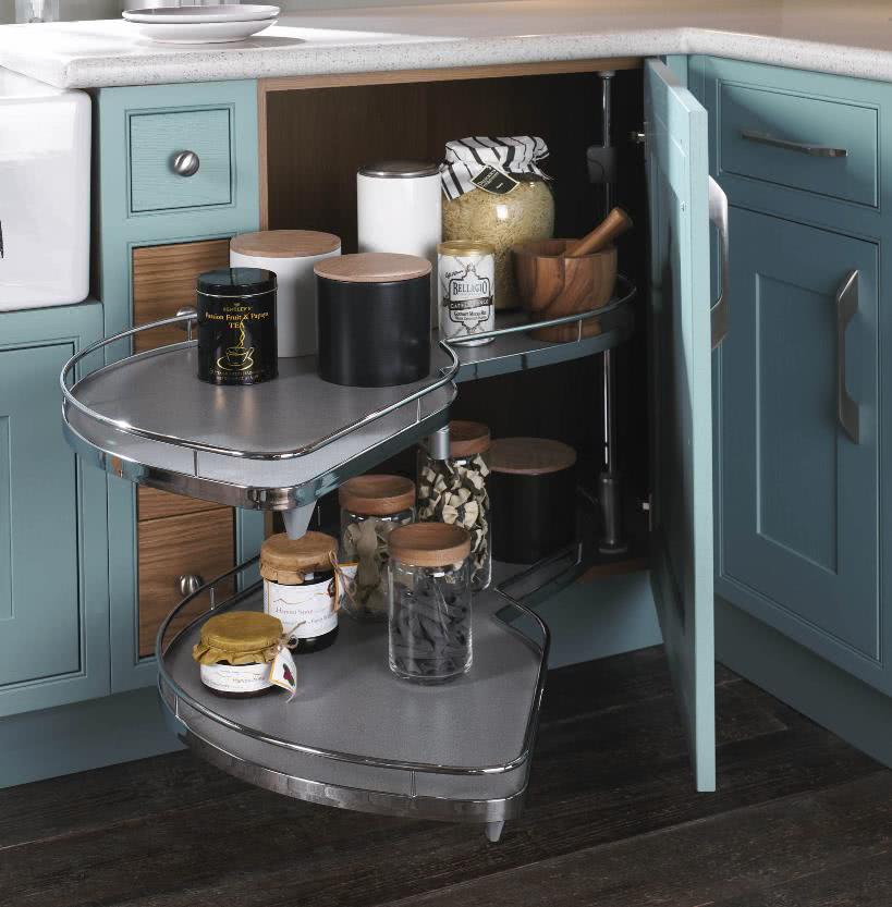 Угловые шкафы особого дизайна – это исключительно практичное новшество, благодаря которому облегчается доступ к их внутреннему пространству. Благодаря этому вы легко найдете место даже для самых больших кастрюль и сковородок, а при их снятии вам не придется рыться во всем шкафу.