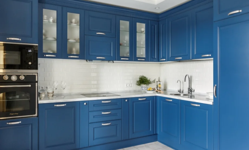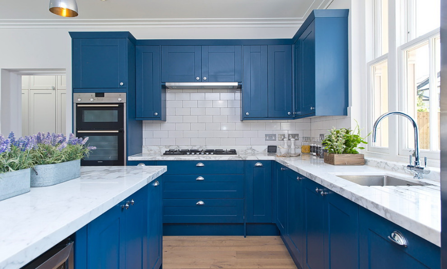 Использование синих оттенков на кухне — неординарный подход к оформлению интерьера. Такие тона создают спокойную и расслабляющую атмосферу, придают уверенности в себе и ощущение защищенности. Дизайнеры рекомендуют отделать потолок небесным оттенком, а стены — нежно-голубыми обоями.
