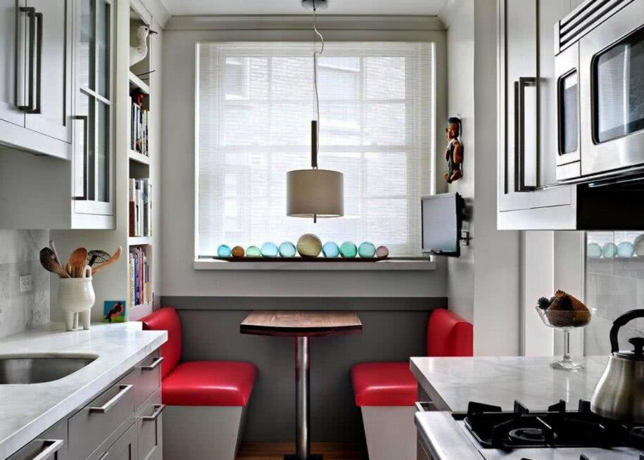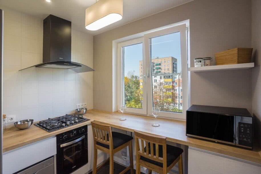 Совет: при П-образной или параллельной планировке вместо полноценного стола можно использовать подоконник. Установив его чуть выше и шире, выйдет отличное уютное место для зоны употребления пищи.