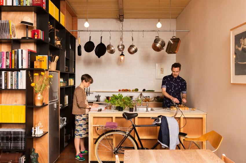 В самом помещении лучше сильно не увлекаться традиционными кирпичными стенами, скомбинировав их с белыми. Сэкономить площадь помогут барная стойка в качестве обеденной зоны и полки вместо массивных шкафов.