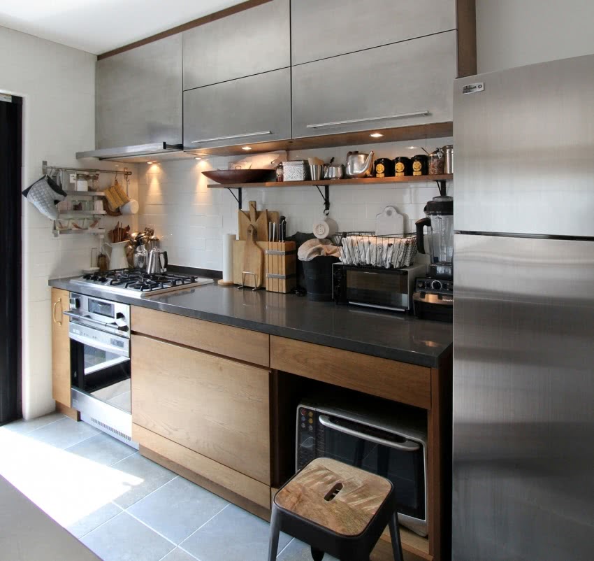 Красиво смотрится на таких кухнях зонирование при помощи комбинированного напольного покрытия из различных материалов, которое позволяет выделить рабочую зону, место для приготовления и приема пищи. Если выбор пал на плитку, то ее необходимо приобретать крупных размеров в однотонной расцветке. Мелкая же плиточка создаст эффект визуального дробления и «съест», итак, не хватающие квадратные метры.