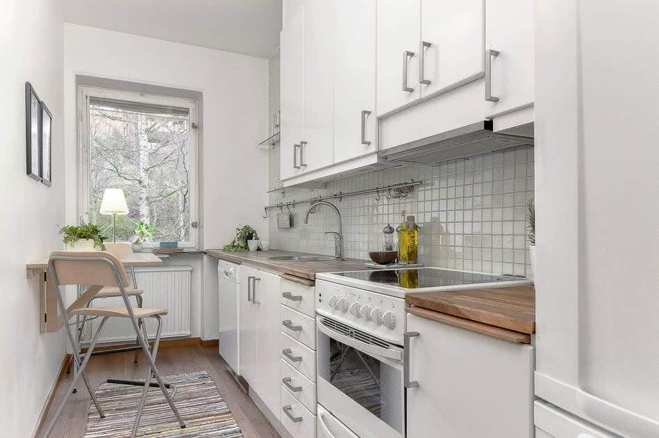 Совет: при П-образной или параллельной планировке вместо полноценного стола можно использовать подоконник. Установив его чуть выше и шире, выйдет отличное уютное место для зоны употребления пищи.