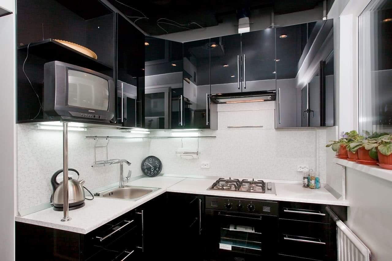 Еще один популярный вариант – угловая кухня 6 кв. м. Ее оборудуют навесными шкафчиками или угловыми полочками. Считается, что угловая кухня для маленькой кухни 6 м — вариант менее удобный, чем первый, но так можно разместить больше предметов мебели.
