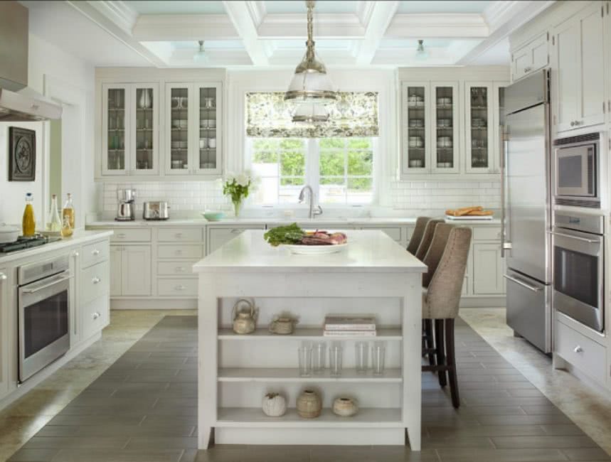Зонирование при помощи выделения разных частей потолка – куда интереснее. Помещение остается единым, в нем остается больше воздуха и света. Над рабочей зоной кухни, например, потолок обычно делается ниже. Это может быть полукруглый или квадратный вариант. В таком потолке размещается система вытяжки и дополнительное точечное освещение. Между столовой и гостиной зонами может быть просто балка, которая будет создавать невидимую границу.