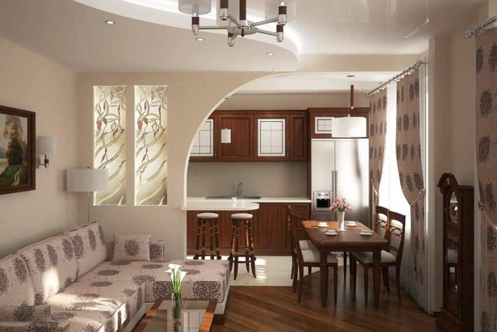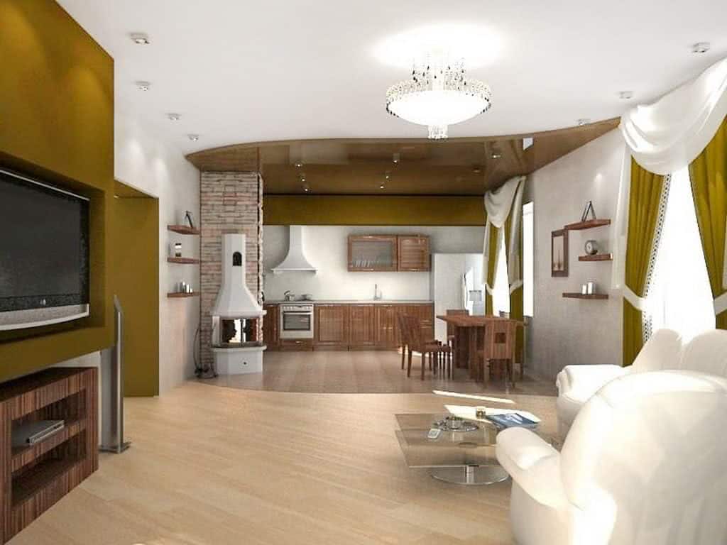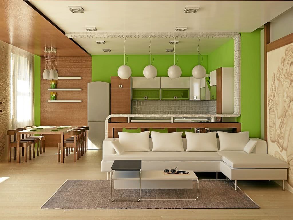Итак, чтобы выделить в одном помещении зоны кухни, столовой и гостиной, можно применить, ширмы, отделку потолка, отделку стен и отделку пола.