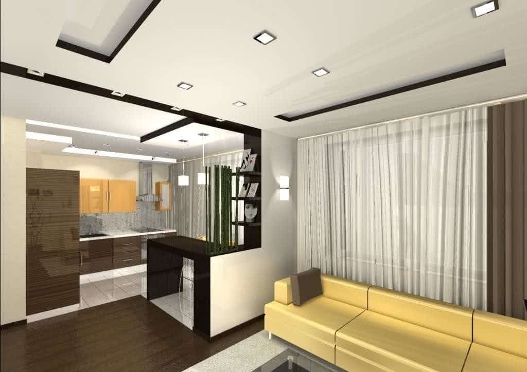 Занимаясь организацией освещения, помните, что с его помощью можно зонировать пространство. Для кухонного треугольника, то есть рабочей зоны, лучшим вариантом станет точечное встроенное освещение. А над обеденным столом или барной стойкой можно разместить потолочные светильники интересного дизайна. Раз уж комната небольшая, то от люстры в гостиной лучше отказаться. Используйте уже известный вариант встроенных светильников.