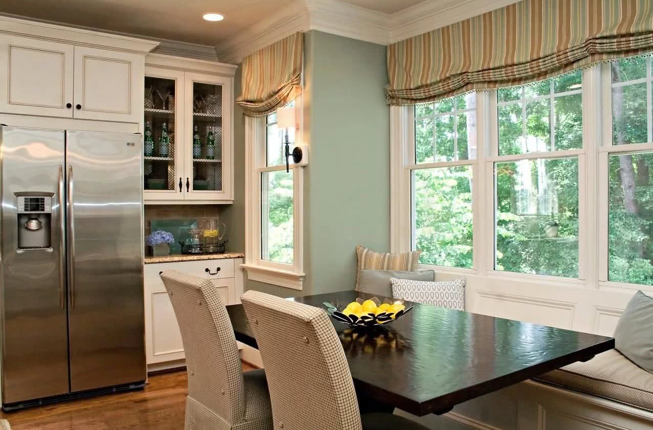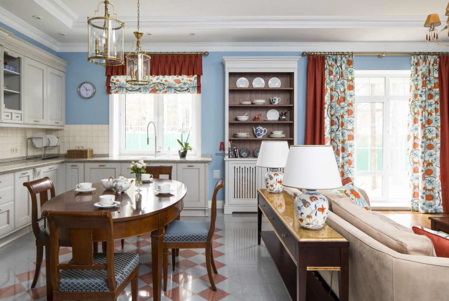 Окна следует украсить красивыми шторами или занавесками, нужно подобрать соответствующую люстру, важным элементом кухни также может стать фартук (для его отделки отлично подойдет керамическая мозаика).