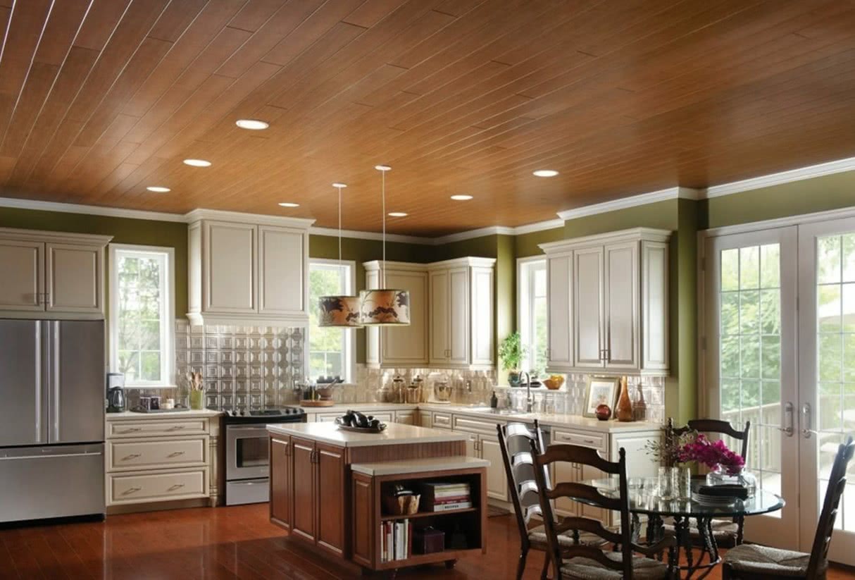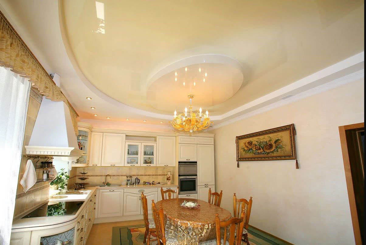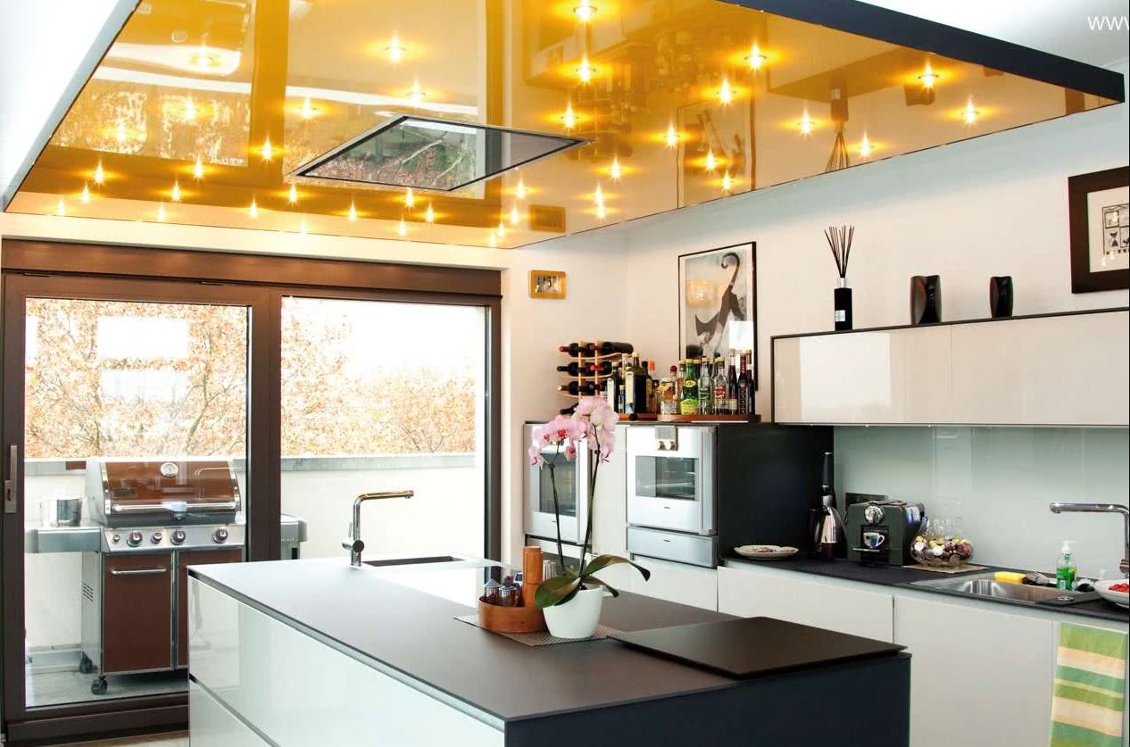 Для потолка оптимальны натяжные ПВХ-конструкции. Они неприхотливы в уходе, не горючи и дают идеально ровную поверхность.