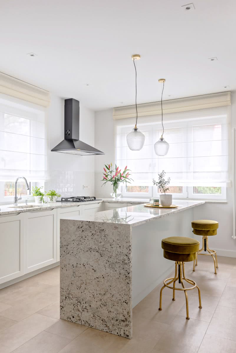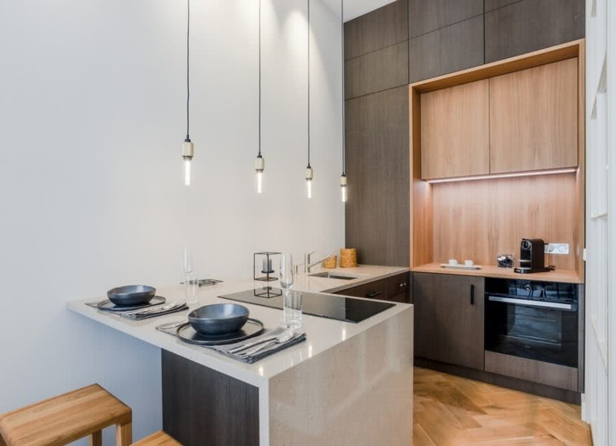 На модной кухне в 2022 году обязательно стоит использовать лампы, висящие над кухонным островом или столешницей (когда нет верхних шкафов). Эта тенденция была заметна как минимум десять лет, но в 2022 году дизайнеры будут уделять ей больше внимания. Почему? Подвесное декоративное освещение прекрасно контрастирует с простотой и минимализмом кухонной мебели, и в то же время делает интерьер не скучным.
