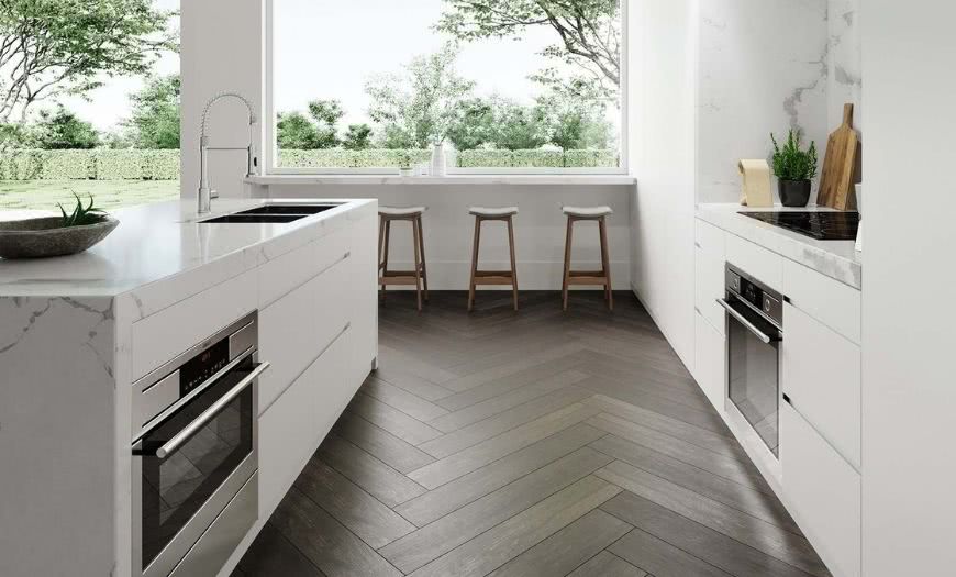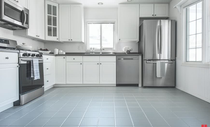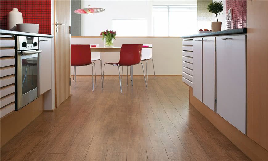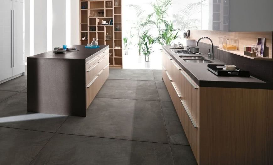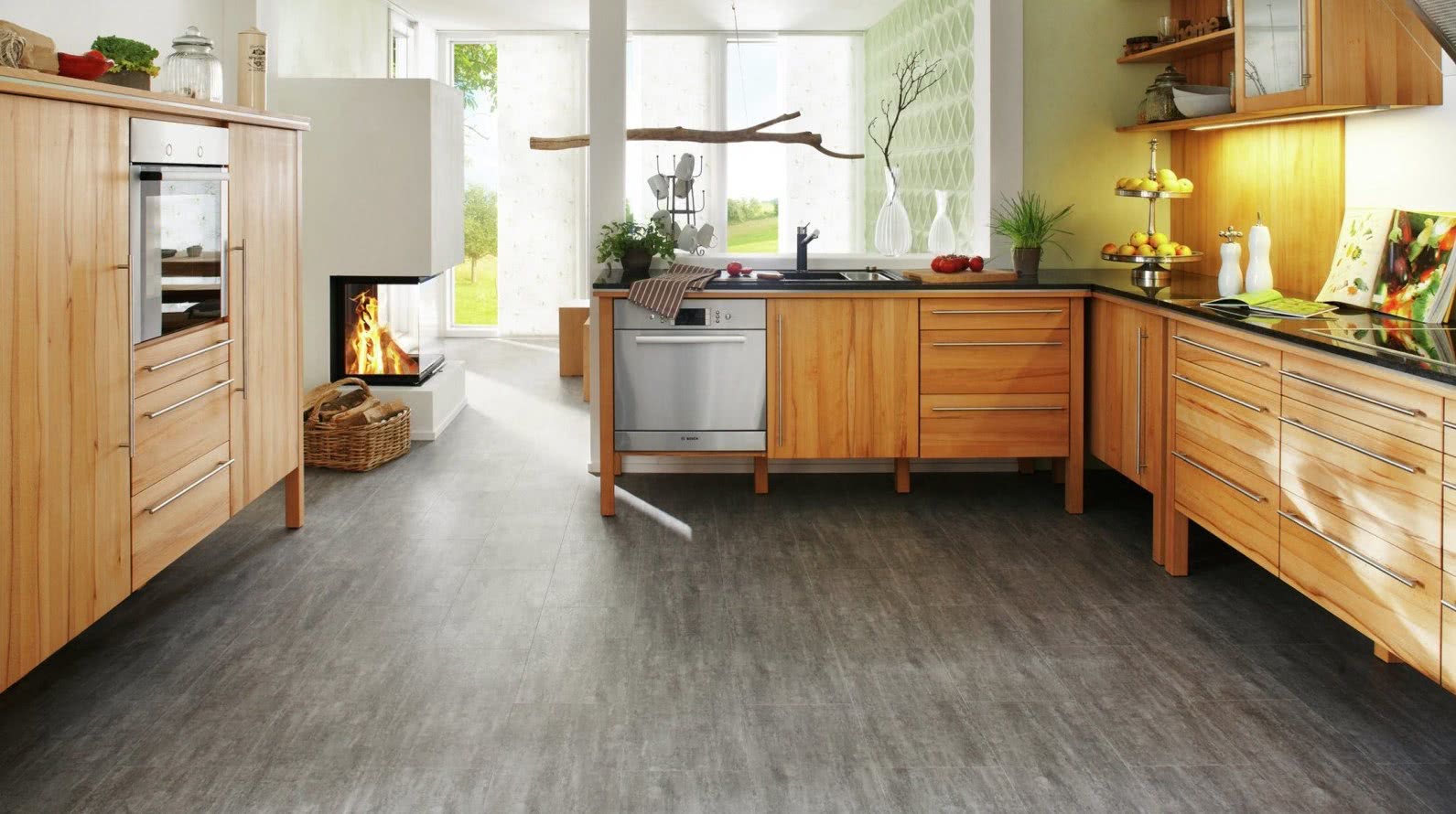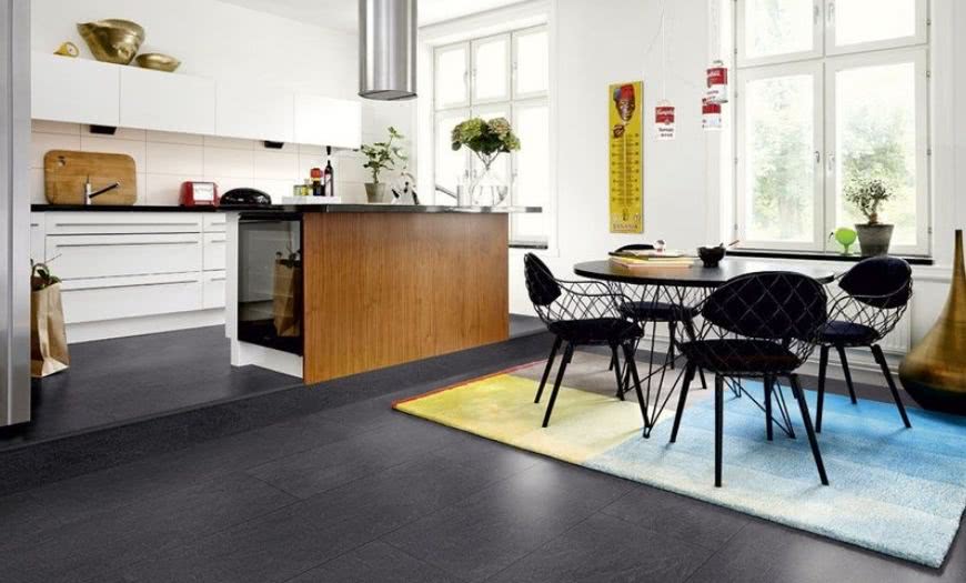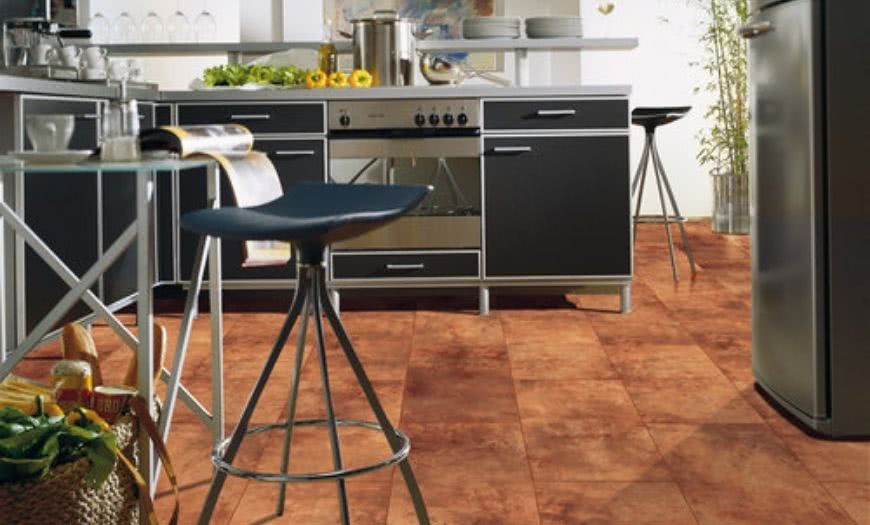 Более простой вариант для пола — линолеум. Желательно на вспененной основе: он потолще и прочнее. А вот ламинат для использования на кухне не подходит — со временем вода затекает в швы и раздувает материал.