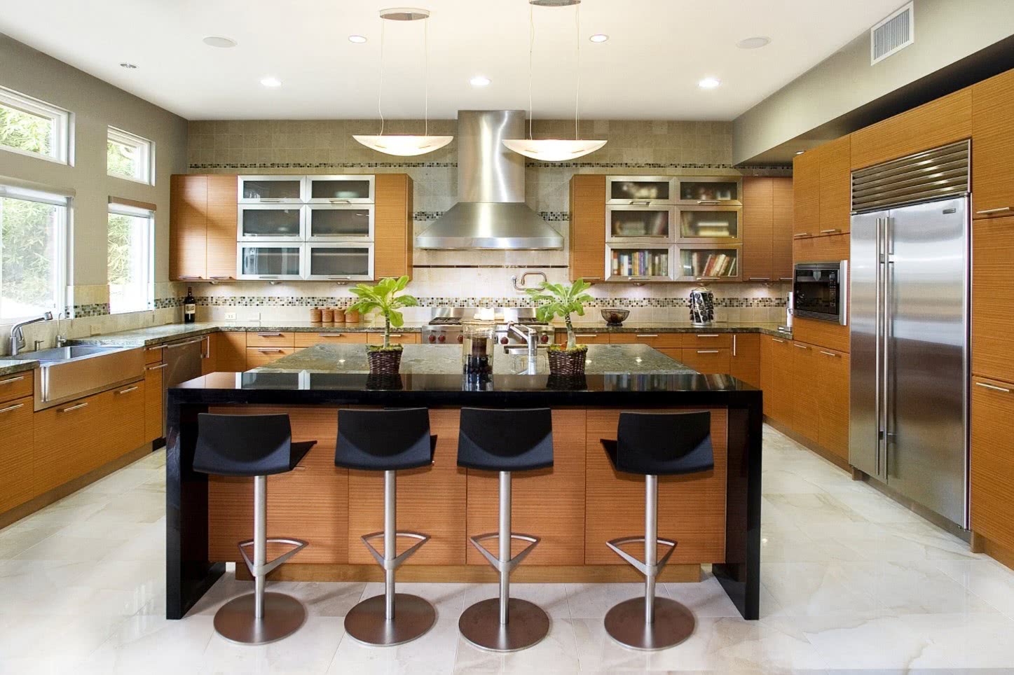 Свободное пространство в частном доме позволяет хозяевам экспериментировать с дизайном кухни. Тут главный акцент нужно ставить на планировку. Помещение делится на функциональные зоны, сюда отлично подойдет практически любой стиль интерьера. Особо отличаются проходные кухонные комнаты или объединенные с гостиной. Отгородить пространство кухоньки можно с помощью барной стойки, столешницы или другой мебели.