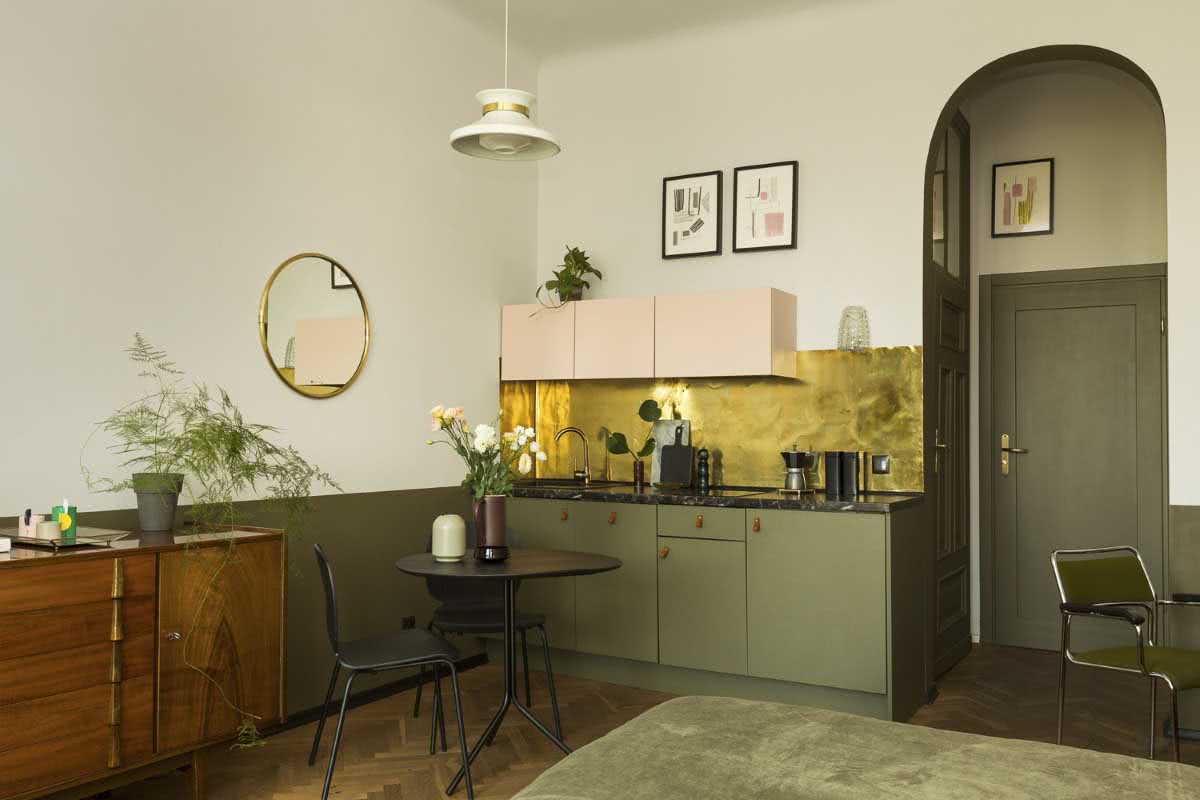 На кухне установлены латунные шкафы, боковые панели и ручки, а также контрастная столешница, изготовленные из черного ламината. Стены окрашены в масляно желтых тонах. Пол, выполненный из дерева, оттеняет золотую тонировку мебели. Смежный коридор выполнен в тонах богатой палитры сливового цвета.