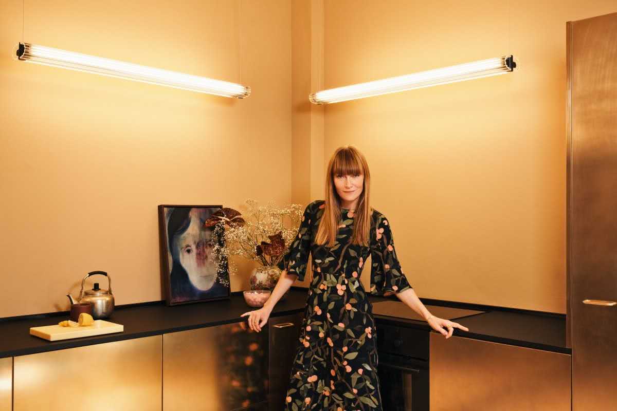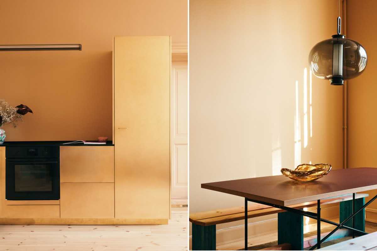 Компания Reform обновила стандартную мебель IKEA по заказу модельера Stine Goya на основе дизайна визуально теплой кухни студии с использованием широкой палитры золотистого тонирования.