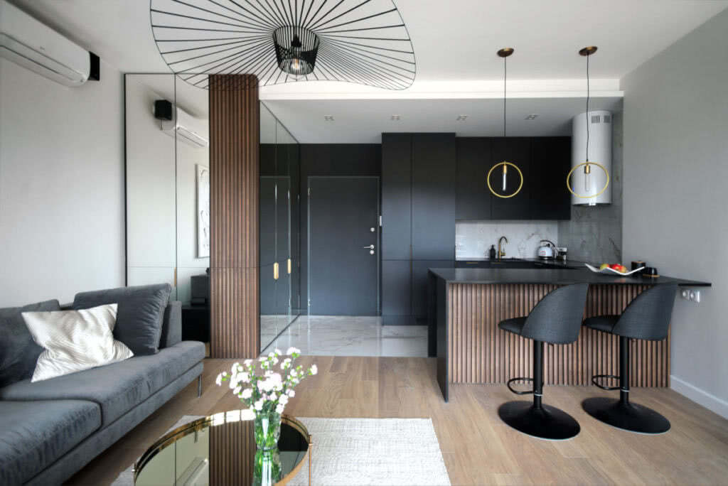 Чтобы этого избежать, можно избавиться от двери, обустроив вместо нее арку. Это сможет визуально расширить пространство и убрать чувство тесноты. В случае, если двери необходимы, одним из вариантов могут стать раздвижные модели, которые в добавок выглядят очень стильно и современно.