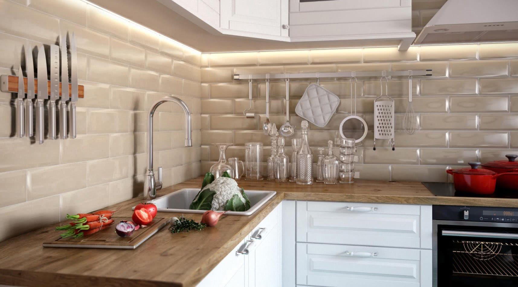 С этих позиций лучше всего смотрится керамическая плитка. Как на полу, так и на стене. С нее легко убрать жир и копоть, вода также быстро убирается тряпкой. К тому же, у этого материала очень много цветовых и стилистических вариаций: от классического белого моноколора до ромбовидной со стеклянными вставками. Срок службы плитки — 20-30 лет, поэтому выбирать рисунок нужно вдумчиво. Назад пути не будет.