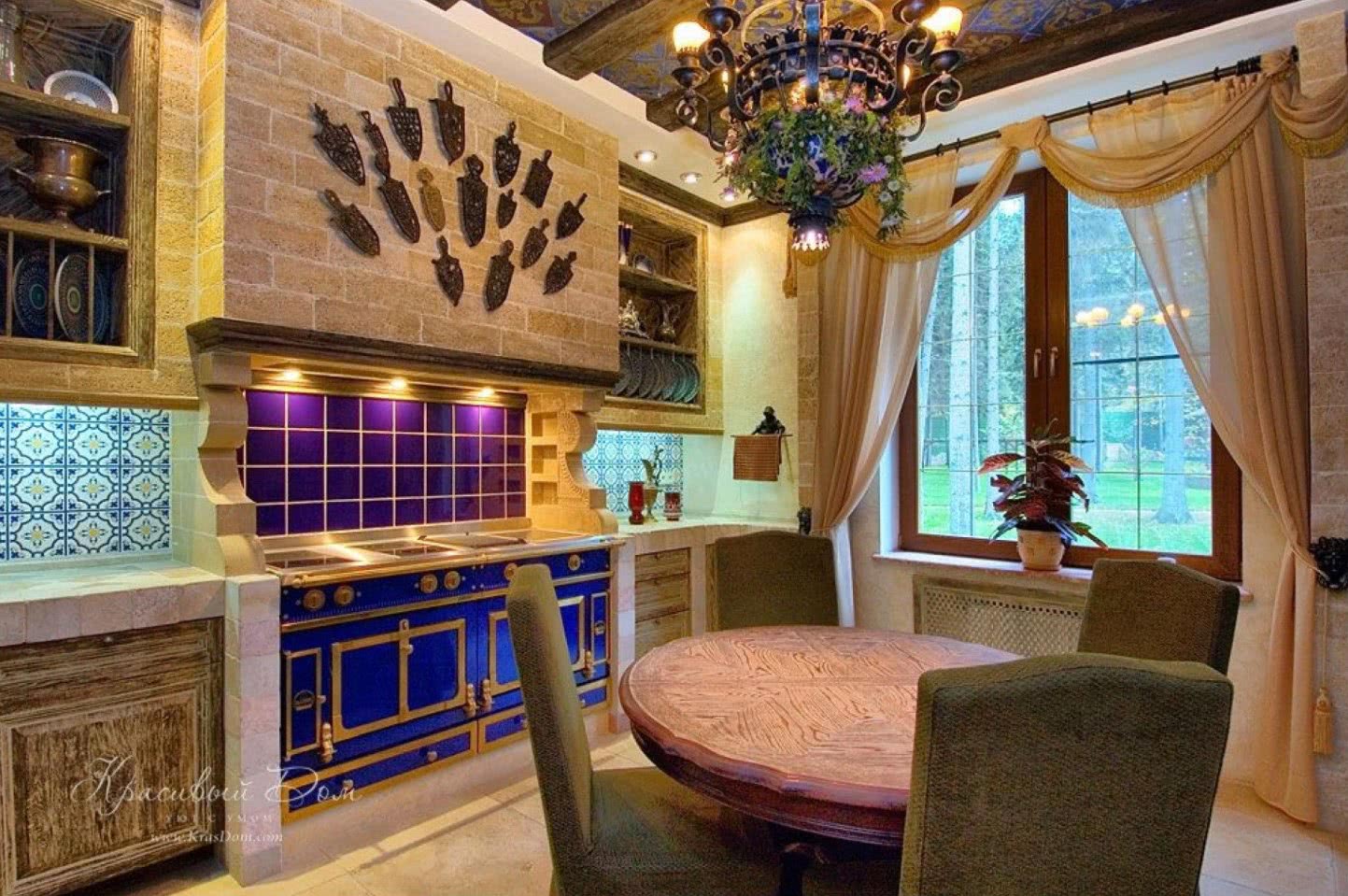 А вот это — очень уютная кухня, а не только красивая: интерьер, как вы видите на фото, интерьер тут домашний и немного старинный.