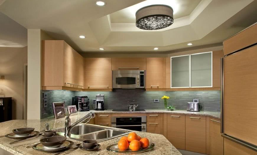 Рабочая поверхность должна быть хорошо освещена, поэтому над гарнитуром устанавливают более мощные светильники, либо увеличивают количество устройств.