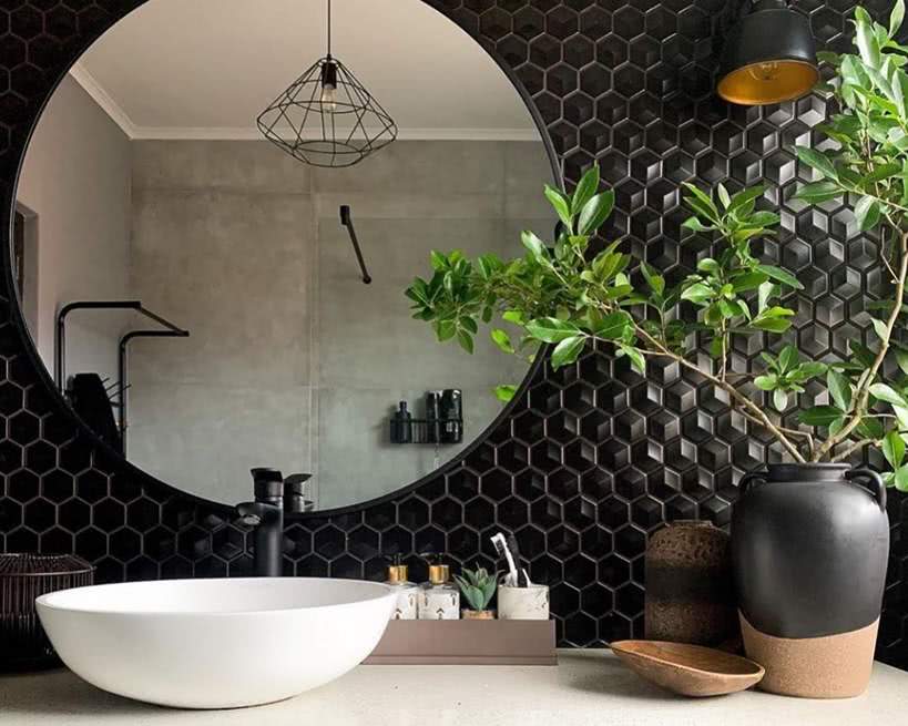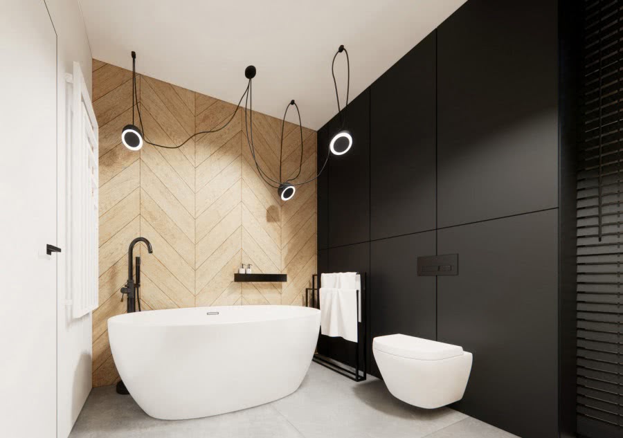 Следующий проект — утверждение темных красок. Смелое использование черного цвета на верхней обшивке и потолке наряду с использованием занавесок в зоне для купания принесло потрясающие результаты. Таким образом, дизайнеры доказывают, что велюру место не только в комнатах. Столь же феноменально он смотрится в ванной.