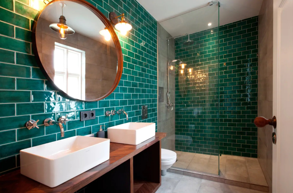Темный зеленый кафель прекрасно выглядит рядом с деревянной мебелью грубой фактурыИсточник roomester.ru