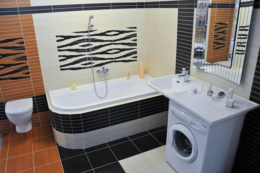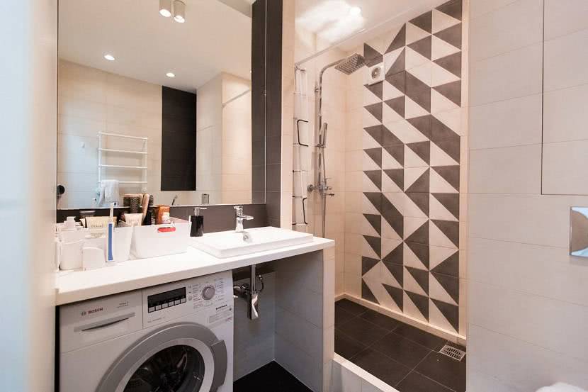 В компактном помещении используют лаконичный стиль. В дизайне ванной со стиральной машиной отсутствуют лишние детали, а функции предметов интерьера совмещены. Агрегат встраивают в столешницу умывальника или располагают в шкафу. Оригинально смотрится модель, для которой оборудовали нишу. В зоне дополнительно монтируют полотенцесушитель или полку для хранения гигиенических средств.