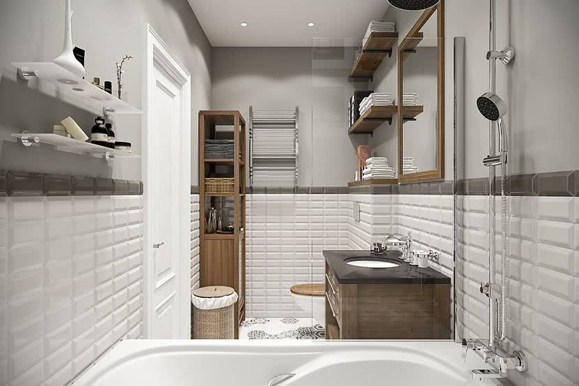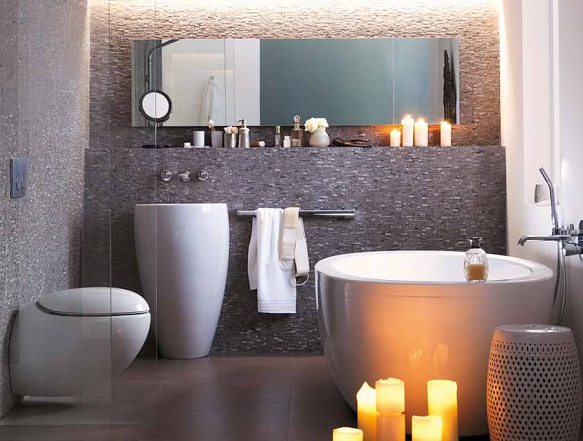 | Эклектика | Достаточно распространенный вариант оформления ванной комнаты. В нем принято сочетать несколько вариантов дизайна. Присущи серый, пепельный и другие мрачноватые оттенки. Не стоит забывать про акценты. Это могут быть банные принадлежности. Для ванны часто обустраивают отдельное углубленное пространство в стене. Отделывают поверхности пиксельной или мозаичной плиткой. Обустраивают встроенные ниши с подсветкой и без. |