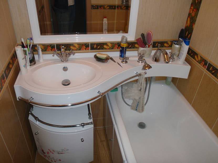 - Рациональный подход позволяет создать необходимый функциональный интерьер. Так, например, зеркало можно разместить на дверце шкафа – получим экономию места и визуальное расширение; а умывальник со столешницей превращаем в полку для банных принадлежностей.