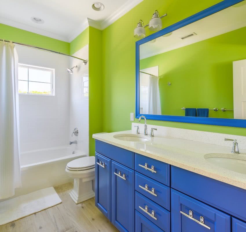 Ярко-салатовые стены ванной комнаты хорошо сочетаются с белой плиткой и контрастной мебелью