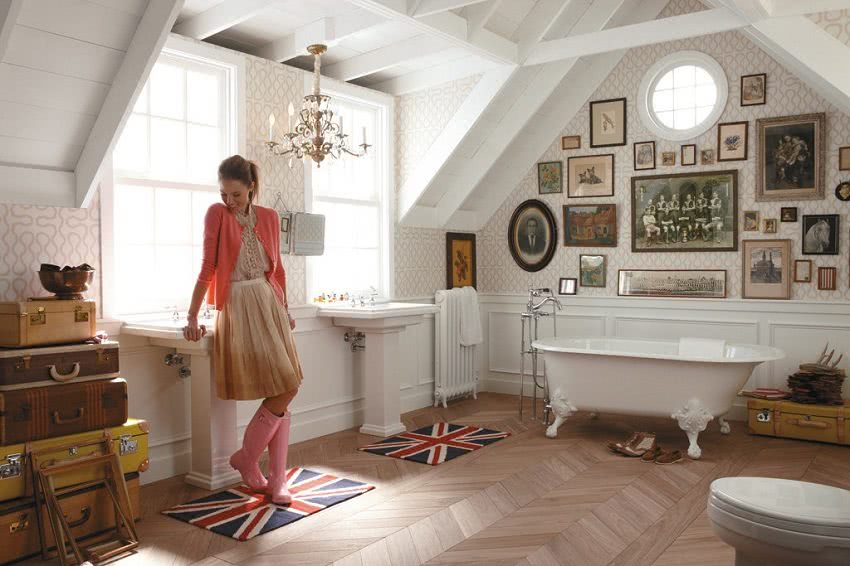 Будет всегда актуальной. Главный акцент – ванна. В оригинале она должна быть из мрамора, чугуна или латуни. И обязательно на гнутых ножках. Такая ванна сама по себе очень светлая; смесители, краны и рамы зеркал выполнены из меди, позолоты или бронзы. В интерьере приветствуется мрамор, лепнина. Вид такой ванной комнаты – дорогой и изысканный.