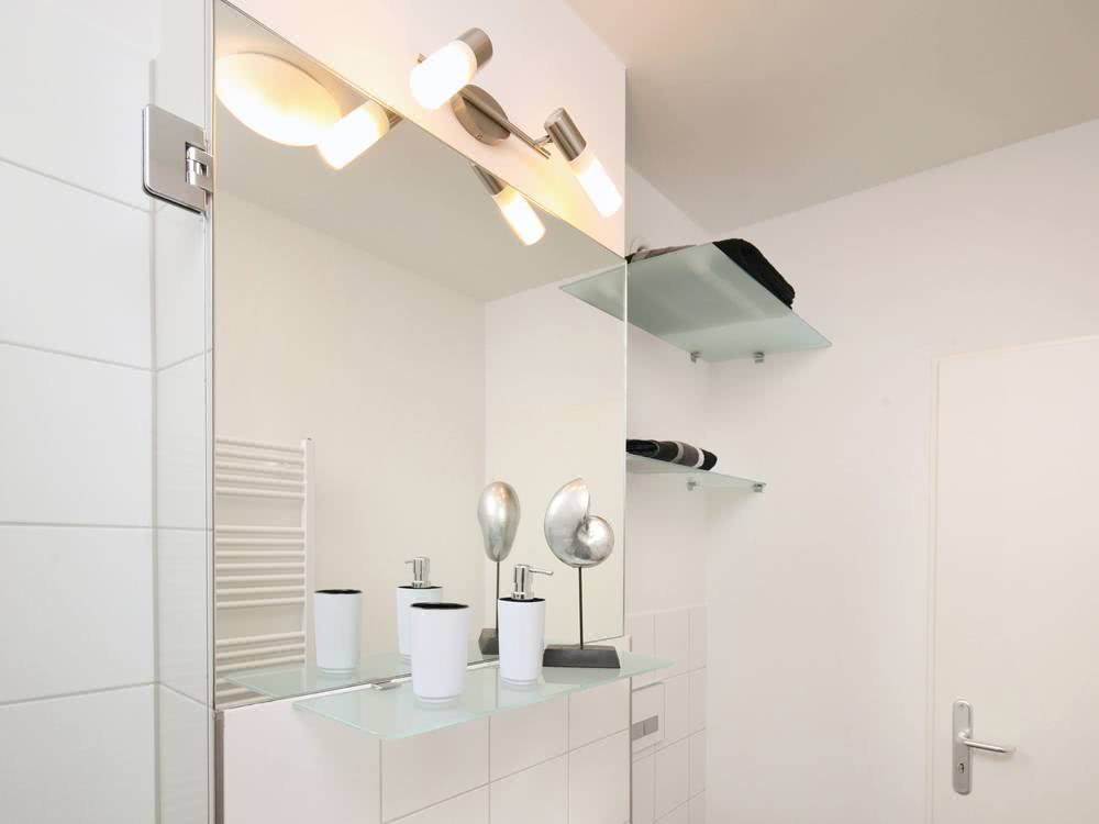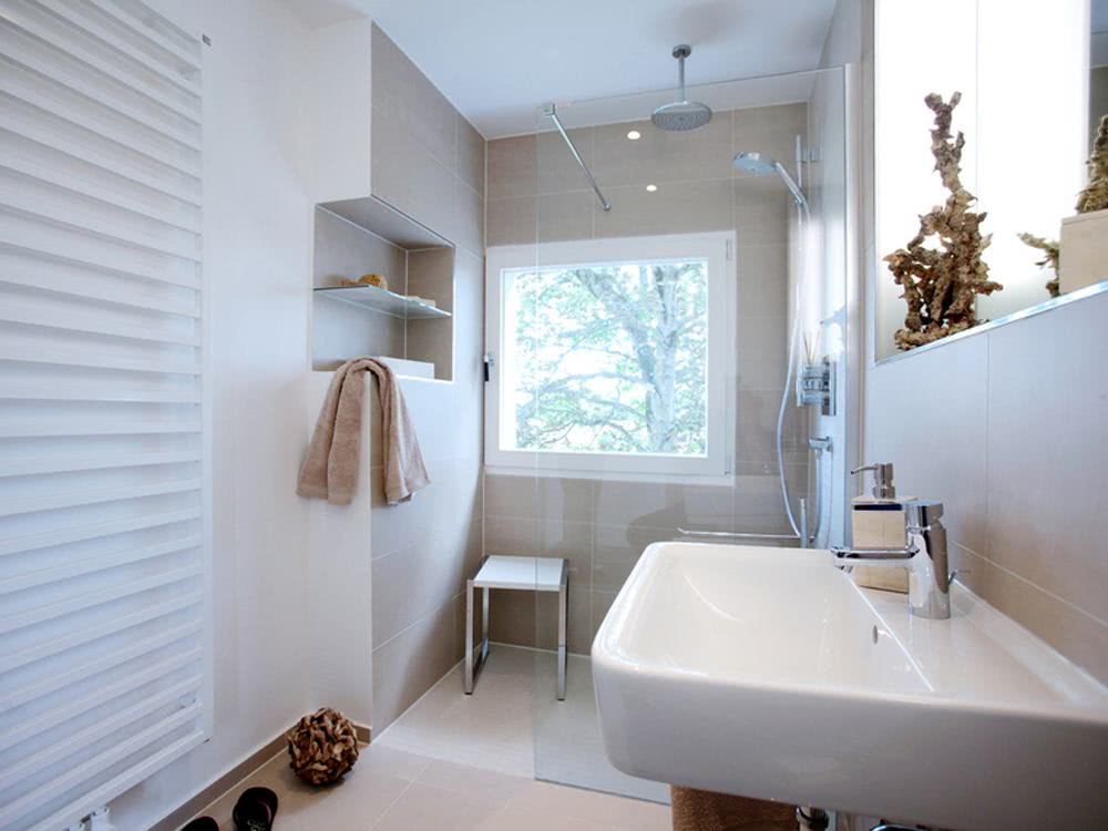 Свободные поверхности делают комнаты более просторными. Поэтому настенная сантехника оптимальна. Кроме того, стоит убирать все, что лежит на полу. К таким предметам относятся весы для измерения массы тела, фен или полотенца. Также коврики для ванной должны использоваться экономно. Вместо нескольких маленьких рекомендуется один побольше.
