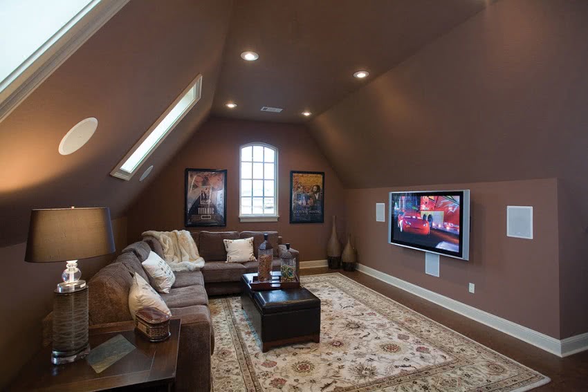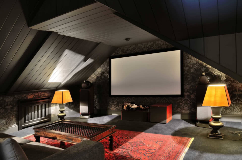 При оборудовании спален, детских, гостиных приходится бороться с недостаточной естественной освещенностью. Если в чердачном помещении создается кинозал, этот фактор рассматривается как существенный плюс. В мансарде в любое время суток можно обеспечить комфортный просмотр любимых фильмов, не опасаясь помех от яркого солнечного света.