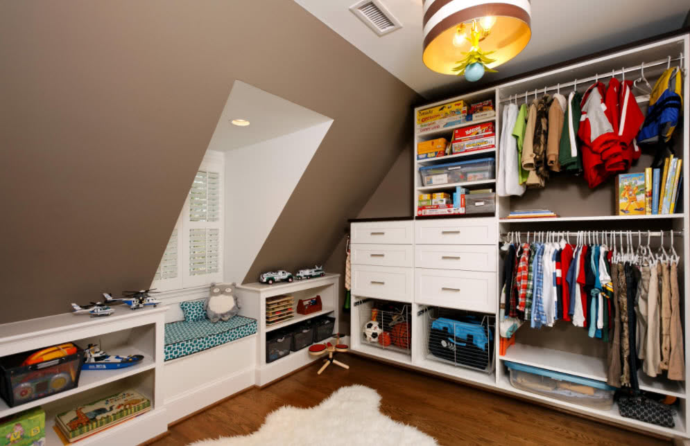Удобно располагать систему хранения вдоль стен мансардыИсточник onedaydoorsandclosets.com