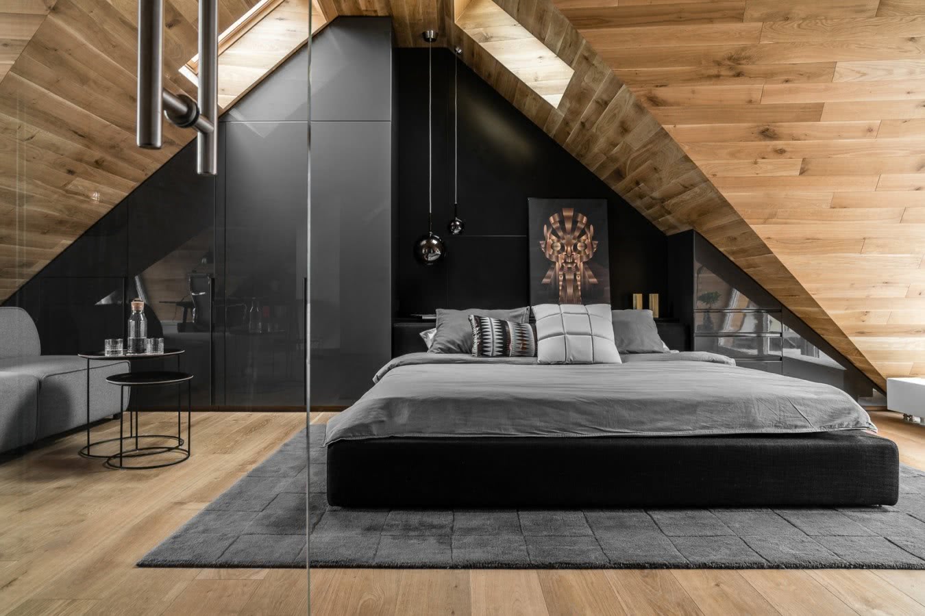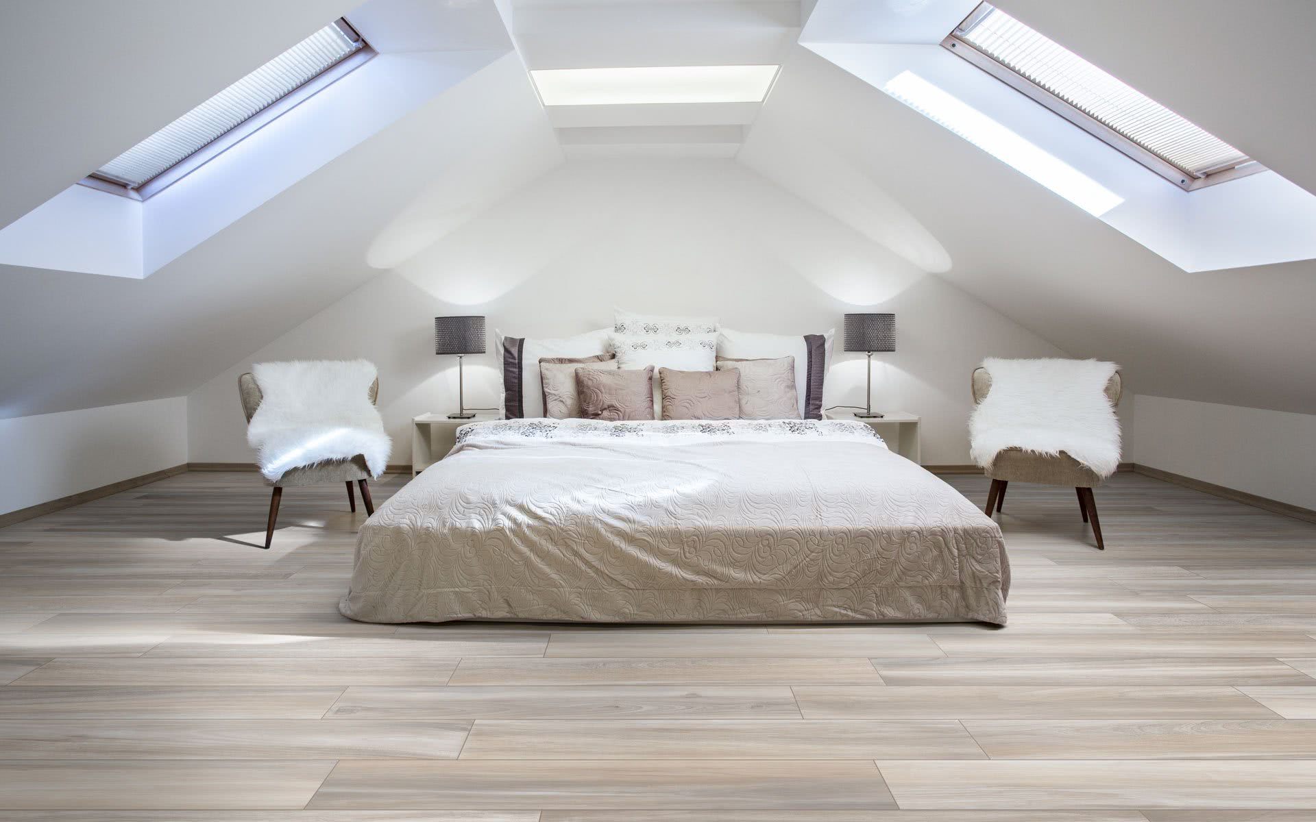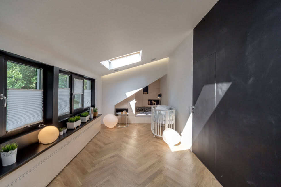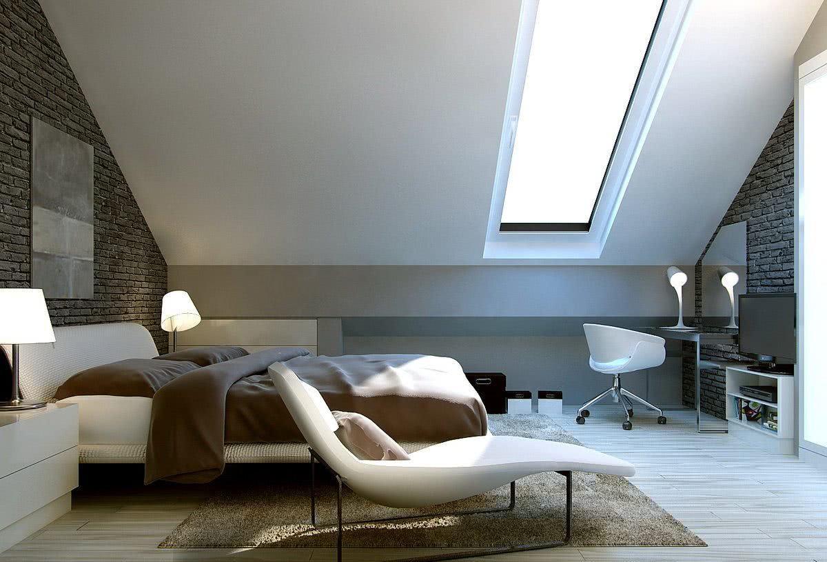 Стиль минимализм подойдет для небольшого по размерам чердачного помещения
