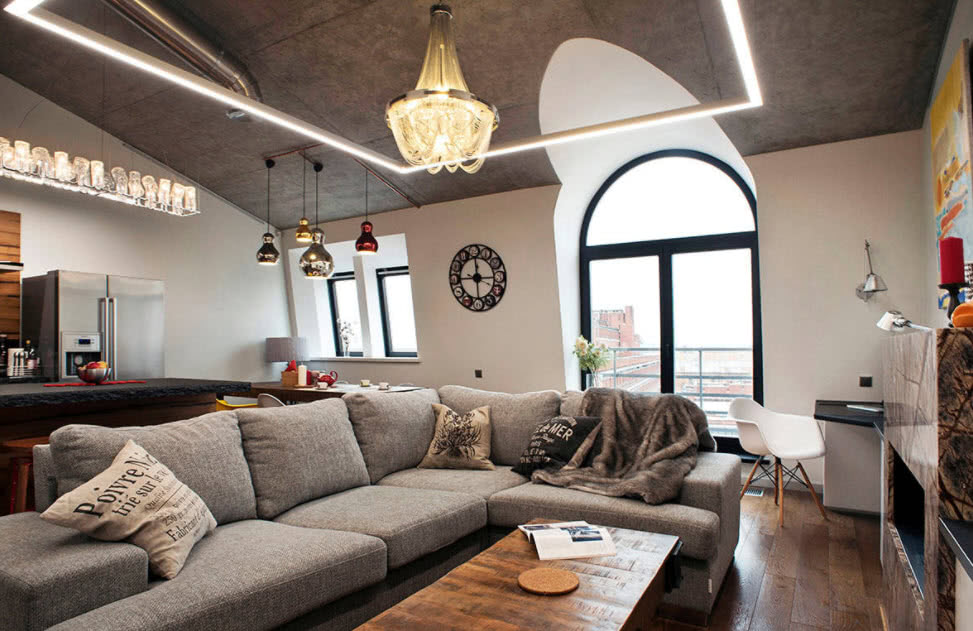 При составлении дизайна важно использовать приемы, помогающие зрительно корректировать сложную геометрию помещения и устранять тяжесть изломов потолка.