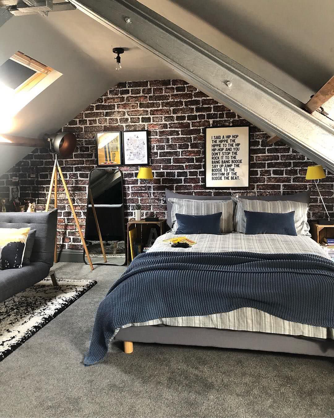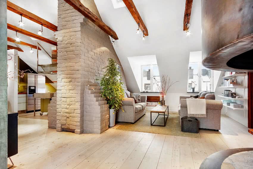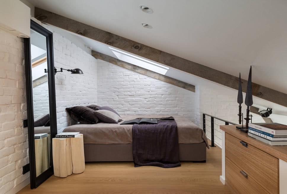 Стиль лофт в интерьере чердачного помещения предполагает наличие необработанного дерева, поэтому можно оставить стены из деревянного бруса или кирпича нетронутыми.