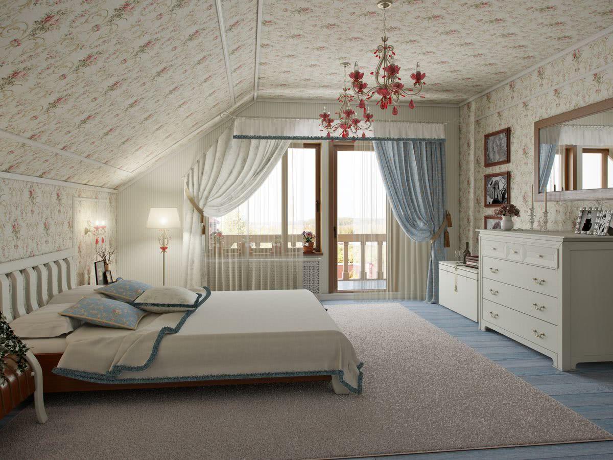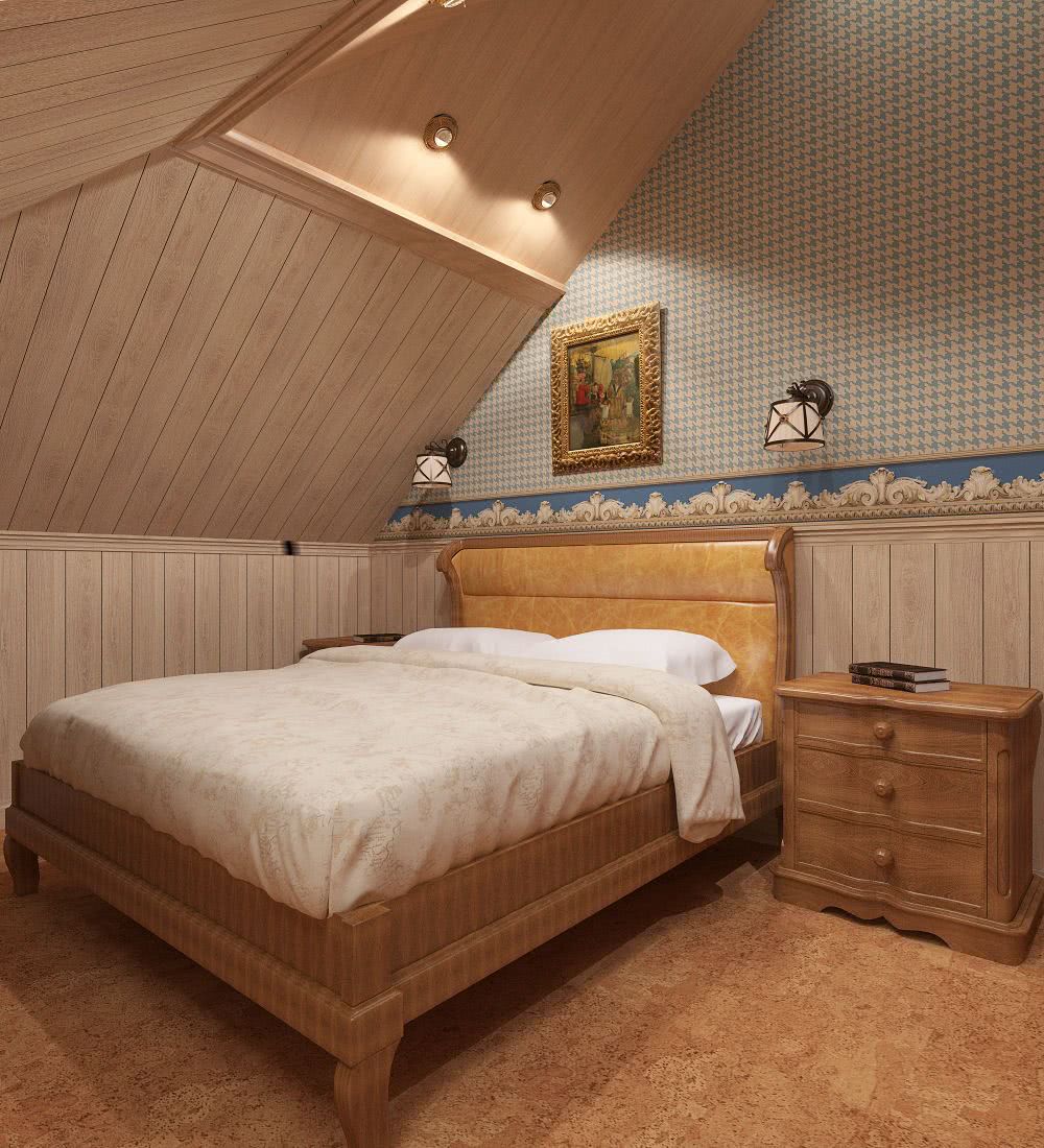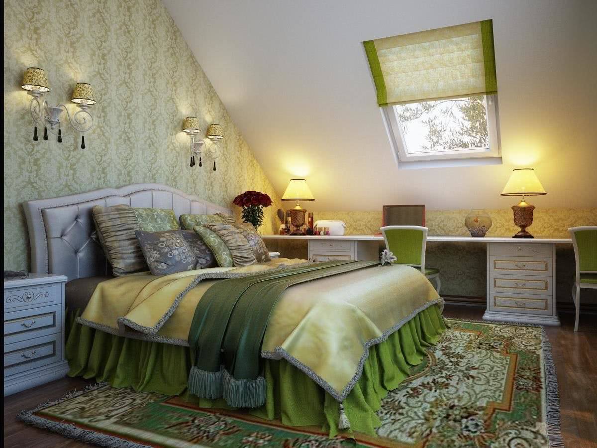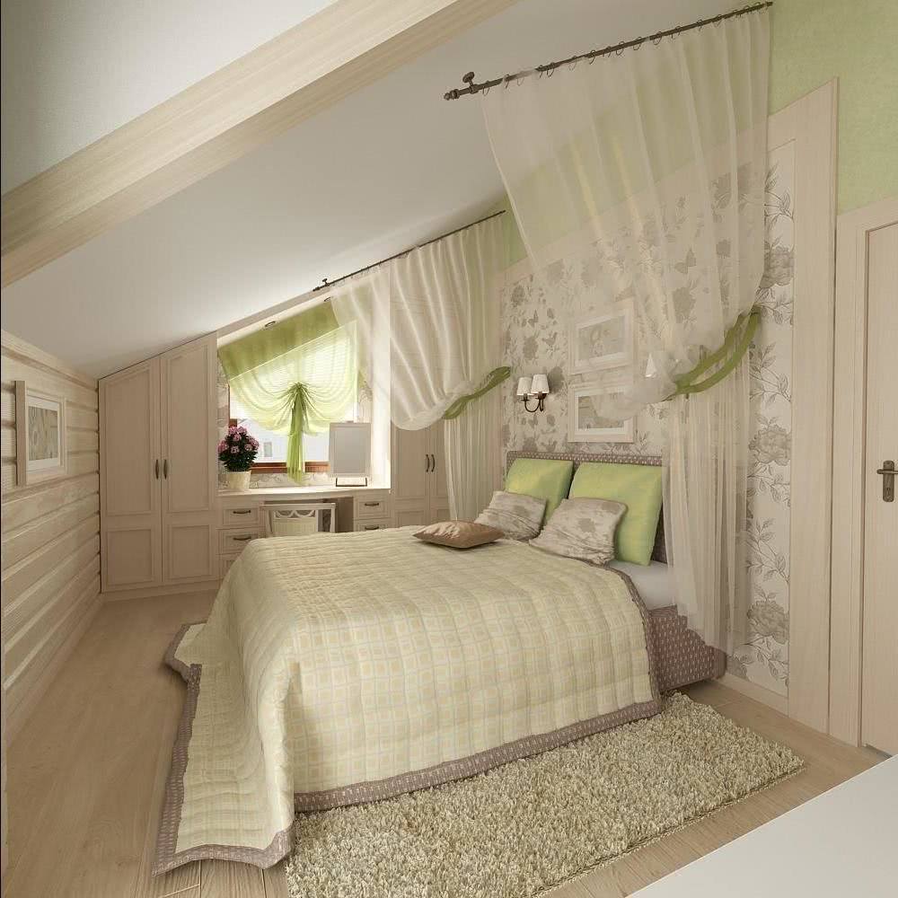 Спальня на мансарде может также содержать дополнительные цветочные мотивы. Скосы и стены лучше окрасить в цвета, относящиеся к природе. Здесь хорошо сочетаются нежная зелень, блюз и различные пастели. Все будет дополнено деревянной мебелью и натуральными декоративными аксессуарами.
