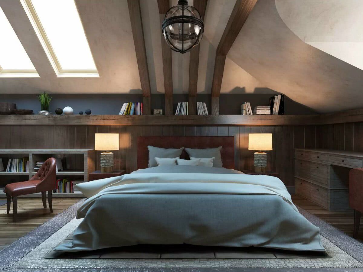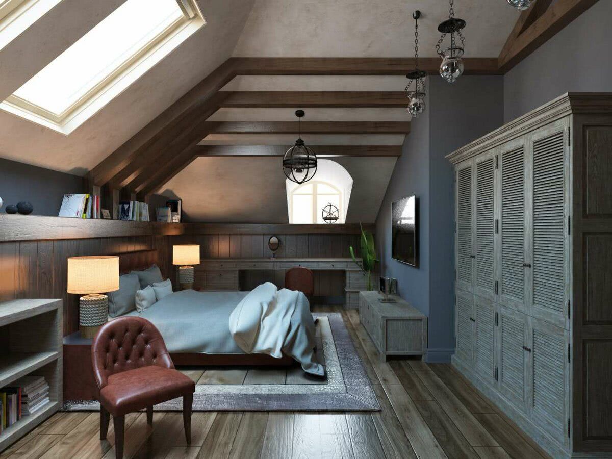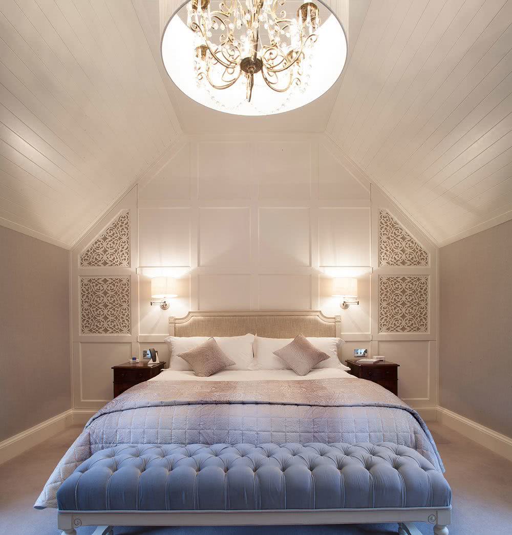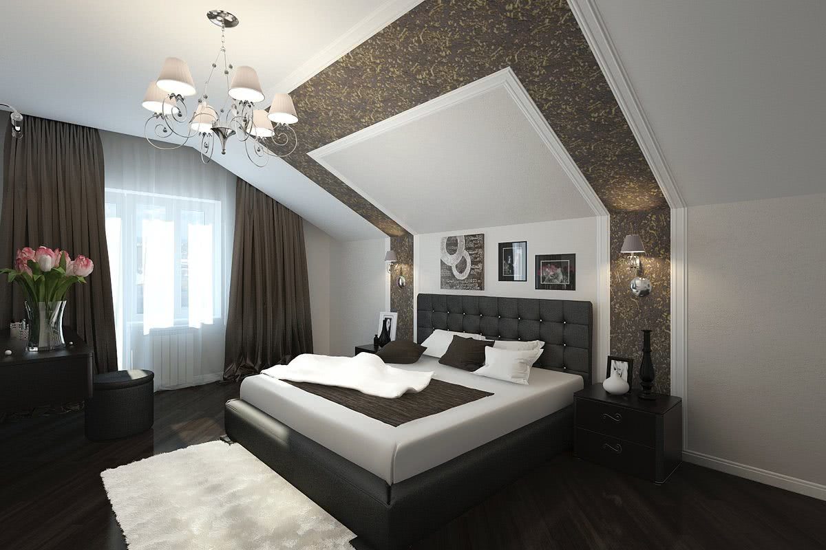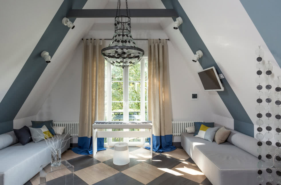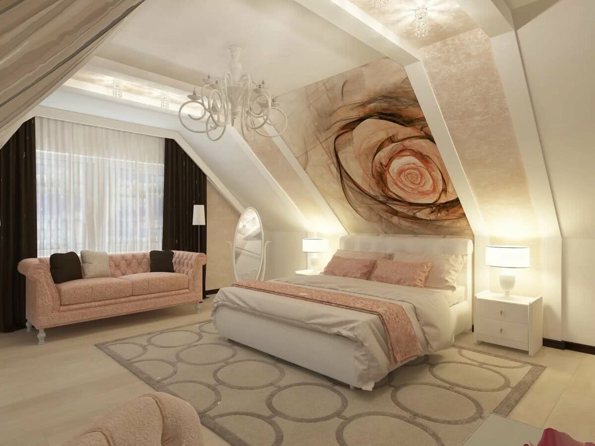 Дизайн должен учитывать конфигурацию помещения, высоту потолков. Из-за скосов, они будут казаться ниже, чем есть на самом деле с одной стороны и вытянутыми до бесконечности по центру с другой.