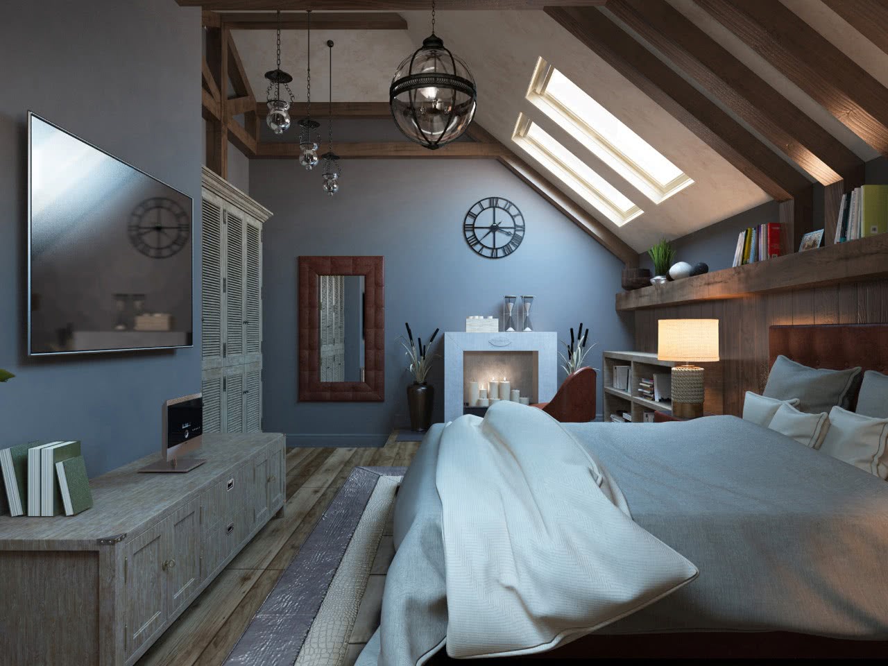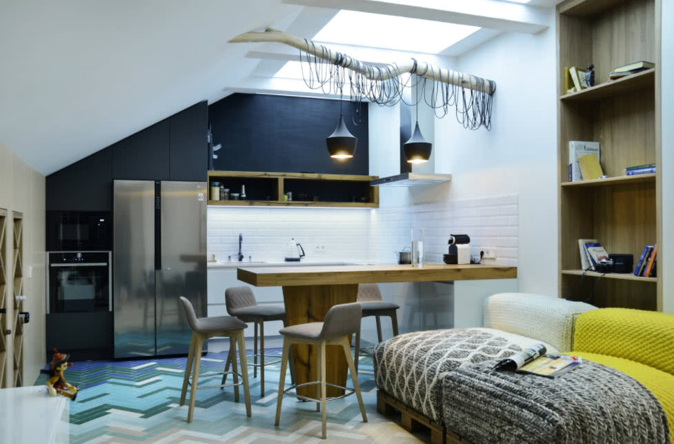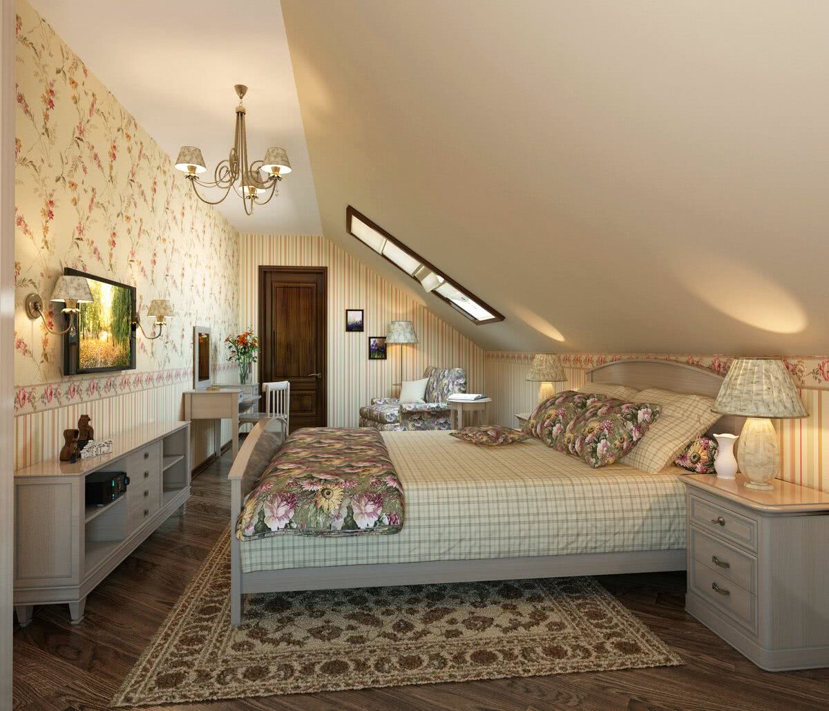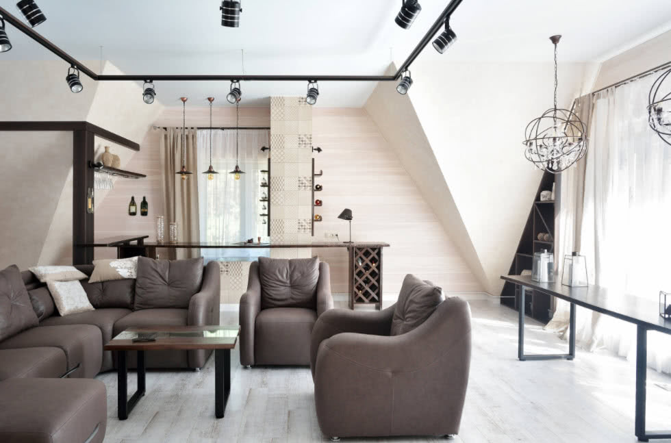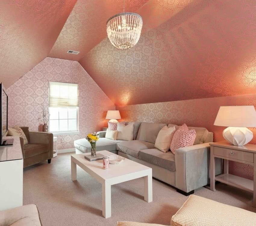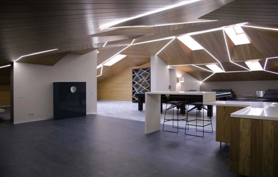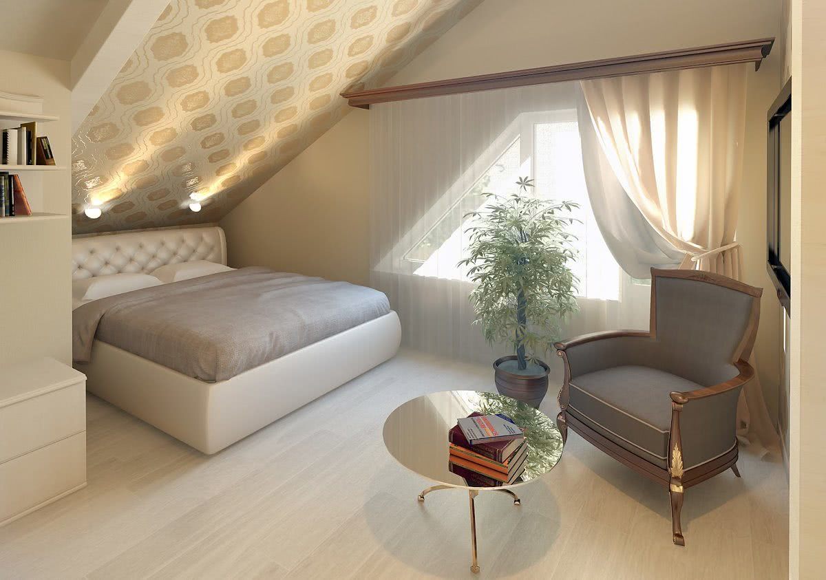 Дизайн должен учитывать конфигурацию помещения, высоту потолков. Из-за скосов, они будут казаться ниже, чем есть на самом деле с одной стороны и вытянутыми до бесконечности по центру с другой.