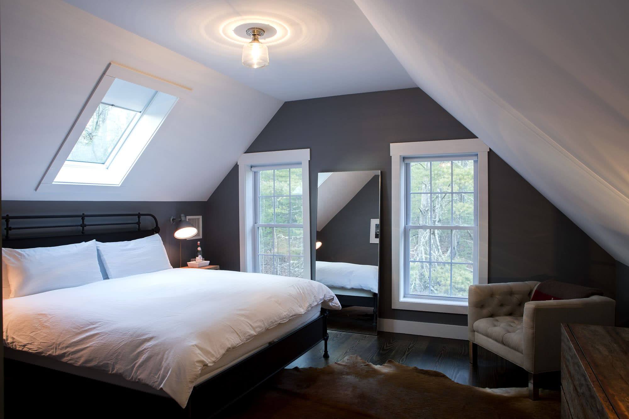 Благодаря мансардным окнам помещение будет освещено естественным светом. Они пропускают достаточное количество солнечного света, а при необходимости можно закрыть окно с помощью римской шторы или жалюзи. Сделать комнату светлее и просторнее поможет большое зеркало.