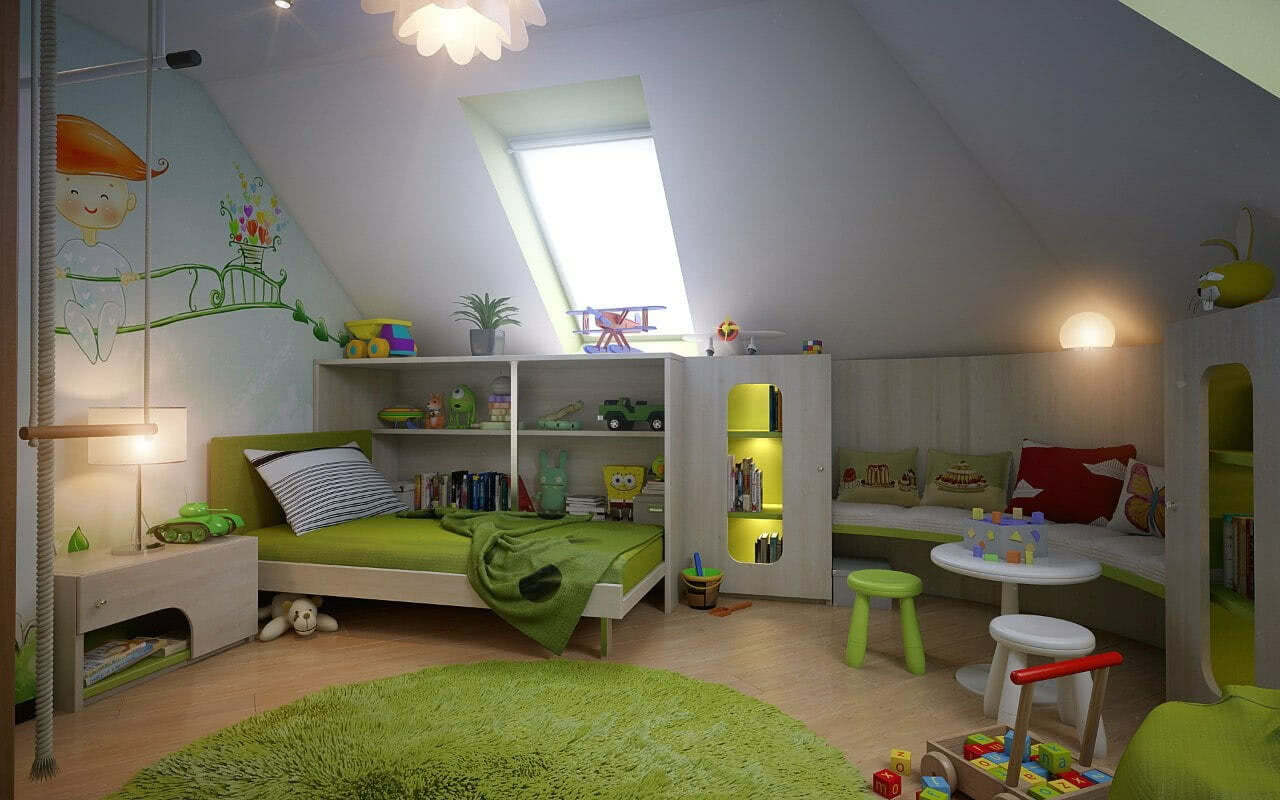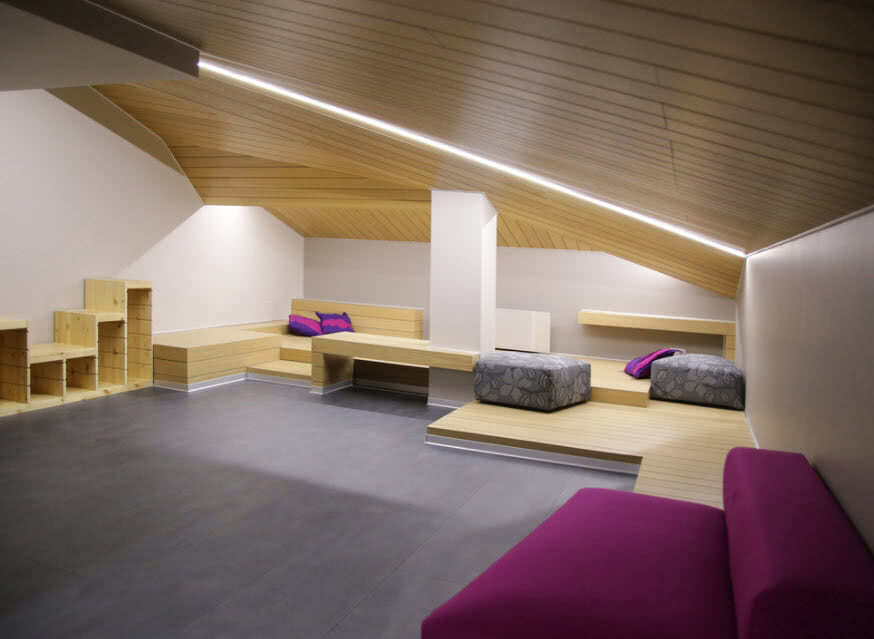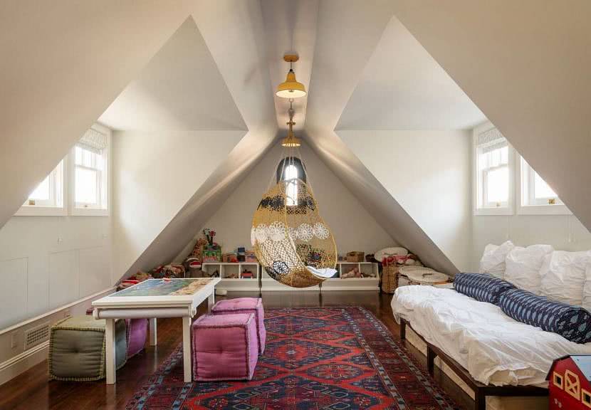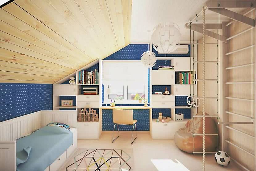 Главное требование к игровой зоне – большое пространство и отсутствие острых углов. В мансарде для активного отдыха используется место, где высота потолков максимальна.