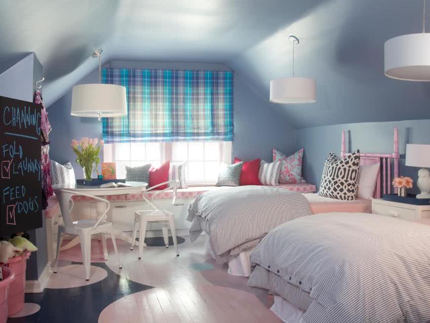 Кровля двухскатной формы отлично подойдёт для создания детской комнаты, рассчитанной для двоих детей. Такой вариант позволяет каждому ребёнку обустроить отдельную зону. Обычно кровати находятся под низкой частью крыши, а центр мансарды остаётся свободным и подойдет для игр.