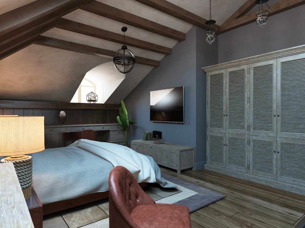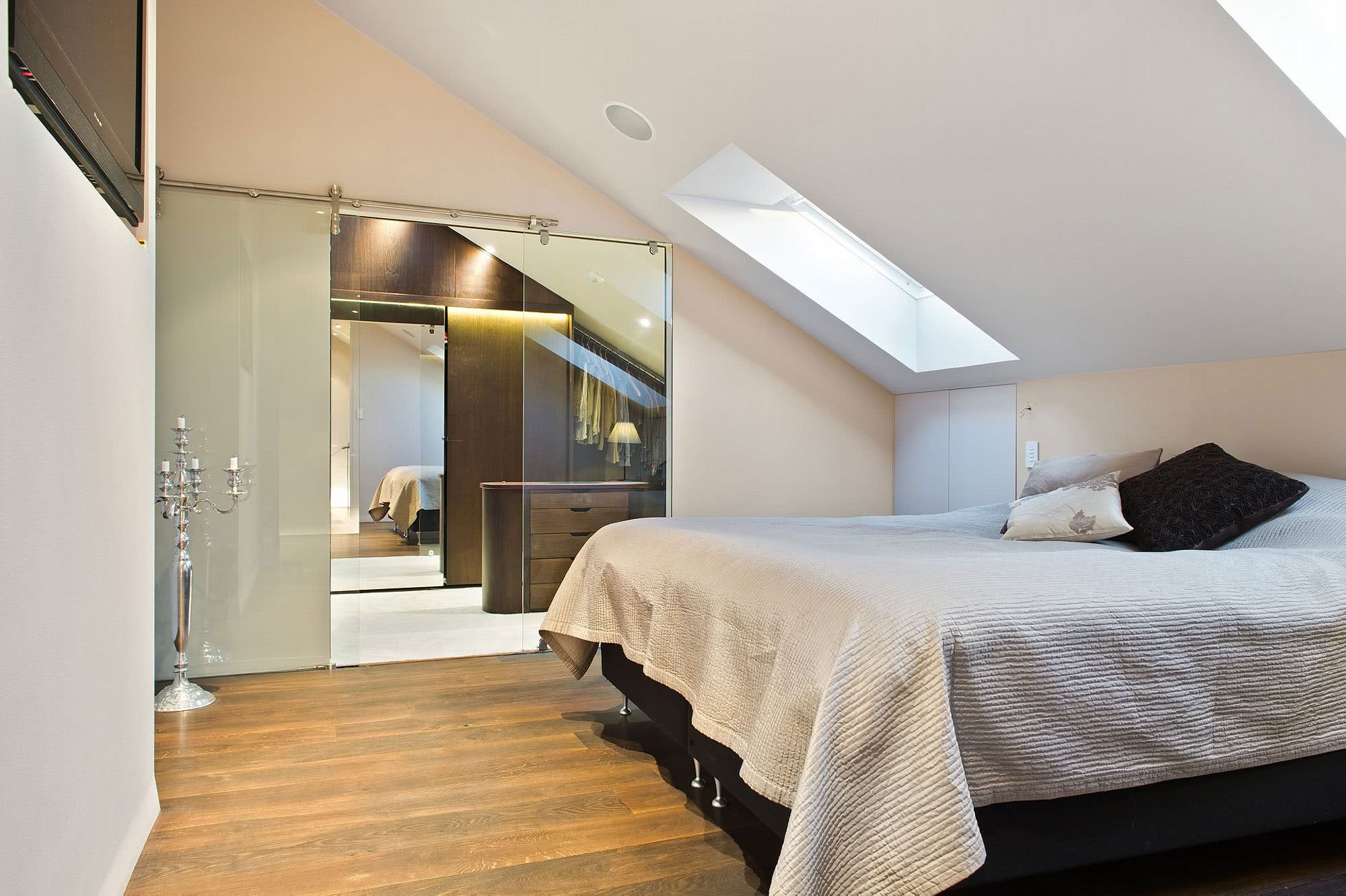 Самым лучшим вариантом при обустройстве спальни на чердаке является односкатная крыша, поскольку она позволяет применять разнообразные варианты обустройства помещения. Дизайн с окном, расположенным в крыше, отлично дополнит интерьер комнаты. Кровать лучше поставить возле стены под наклоном. Шкафы можно расположить вдоль прямой стены.